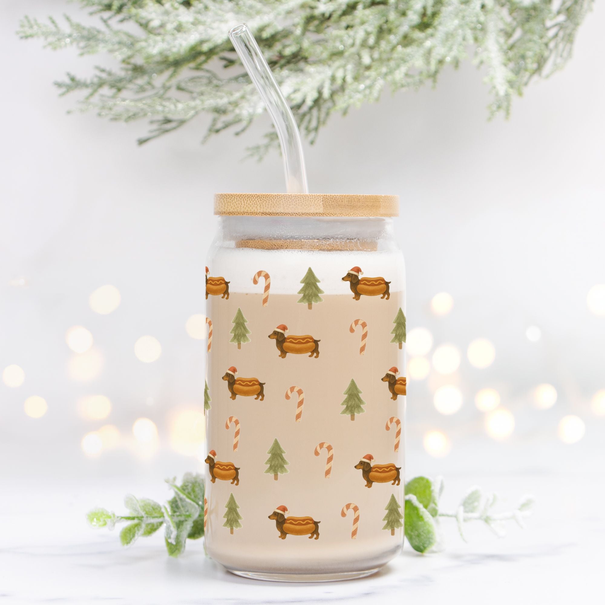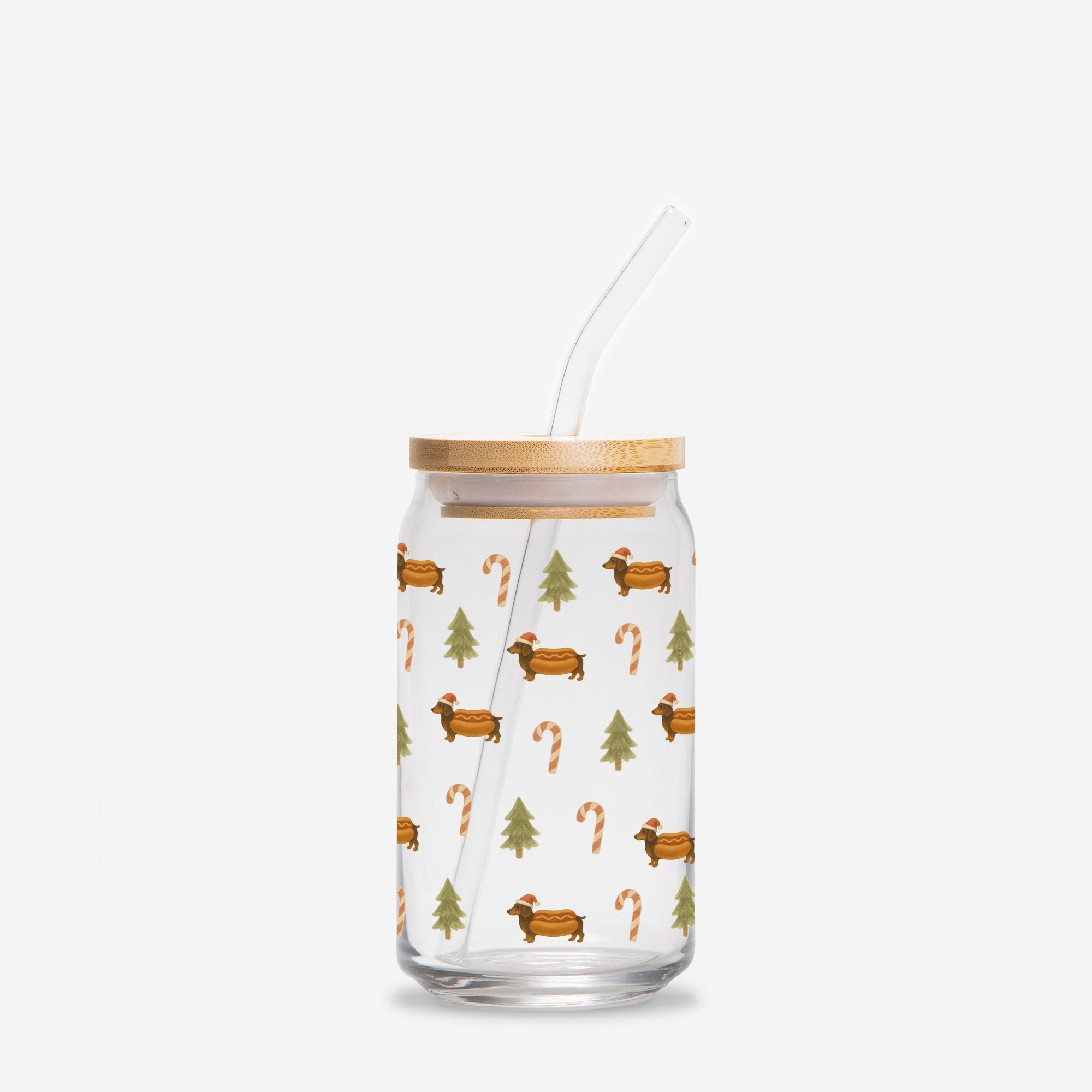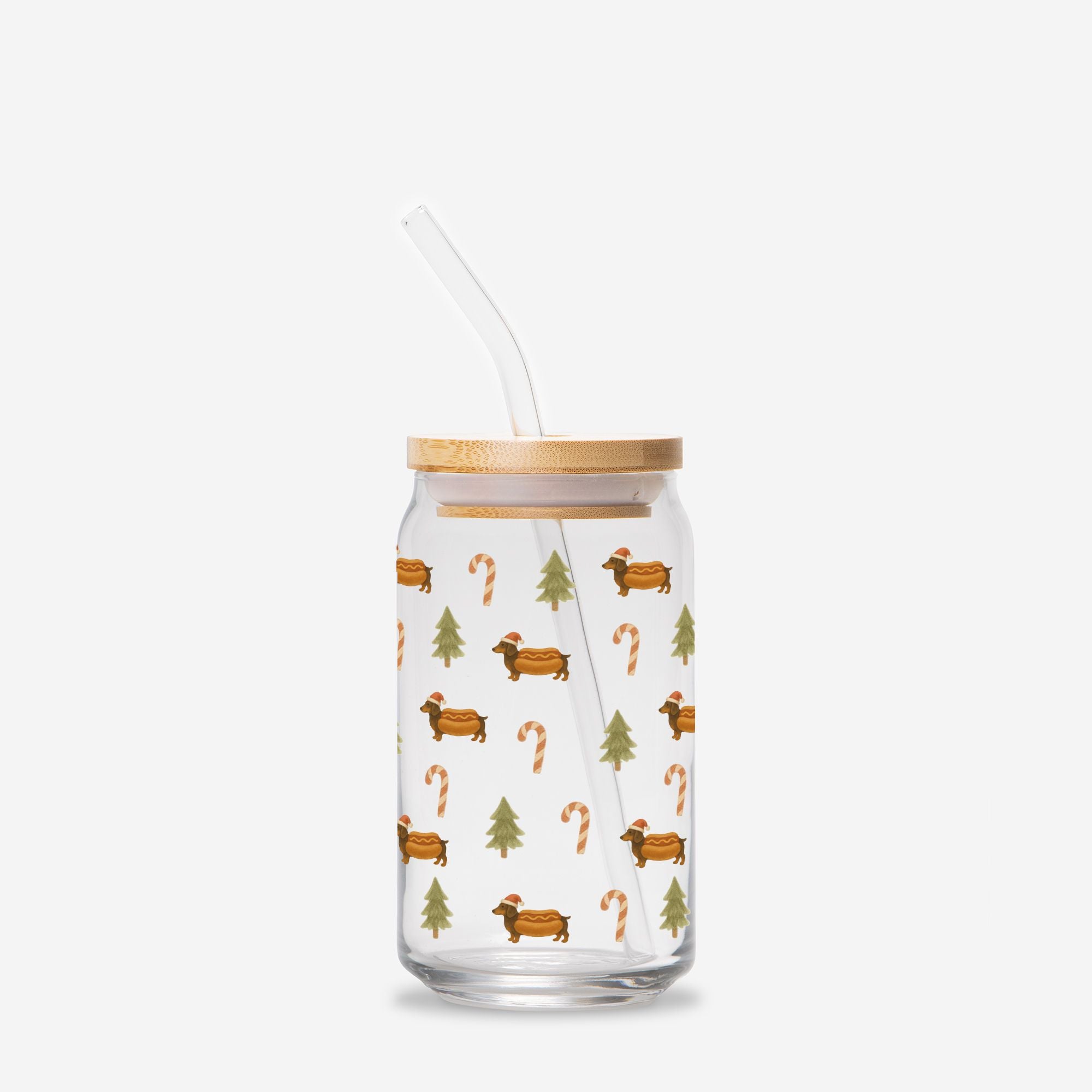 Introducing the Can Shaped Glass - Dach of Gold Holiday Edition, where festive charm meets a delightful tribute to our furry friends. This enchanting piece features our best-selling Dach of Gold pattern, now dressed up for Christmas with an adorable green bow and the silhouette of a long-haired dachshund, perfect for dog lovers everywhere.