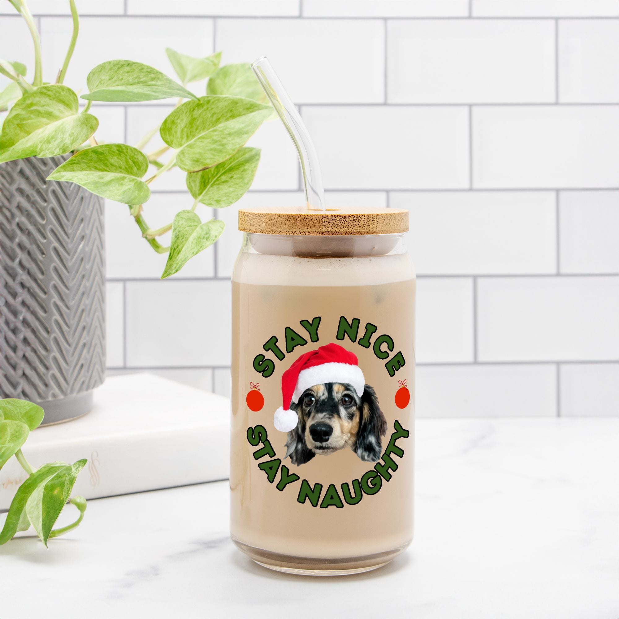 Introducing the Can Shaped Glass - Get Naughty + Get Nice Stripes, the ultimate festive treat for dog lovers! This charming glass features a delightful design that encourages you to "stay nice" on the top and "stay naughty" at the bottom, perfectly paired with a whimsical pet portrait sporting a Santa hat. Personalize this eye-catching glass for a truly unique Christmas gift that any dog mom will adore. Available with an optional straw and lid for those on-the-go sips or just the glass for a classic touch, it's as versatile as it is delightful. Make this holiday season special by celebrating your furry friend in style with this adorable addition to your Christmas 2025 collection. Bring joy and a hint of mischief to your holiday gatherings and show off your love for your pup in the most charming way!