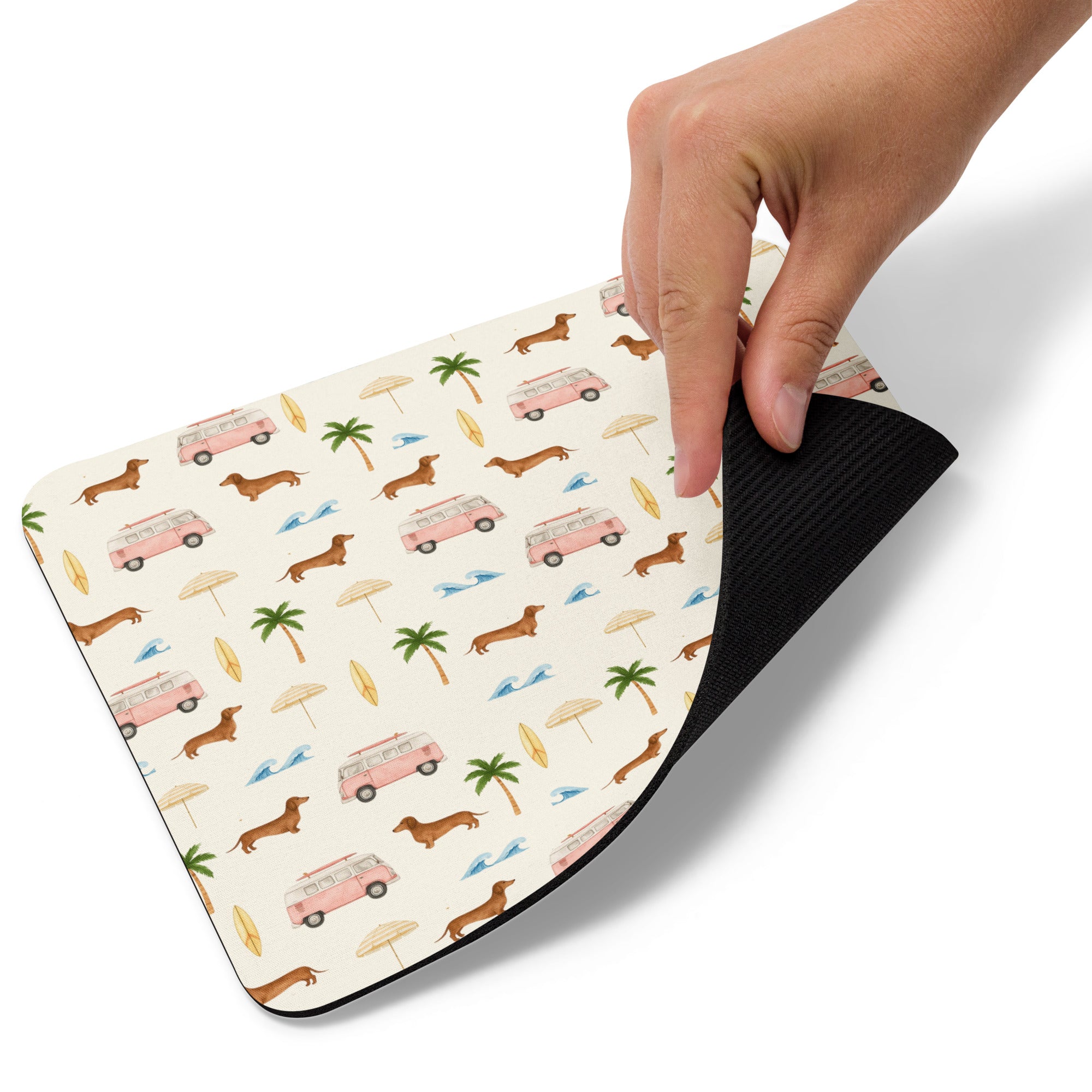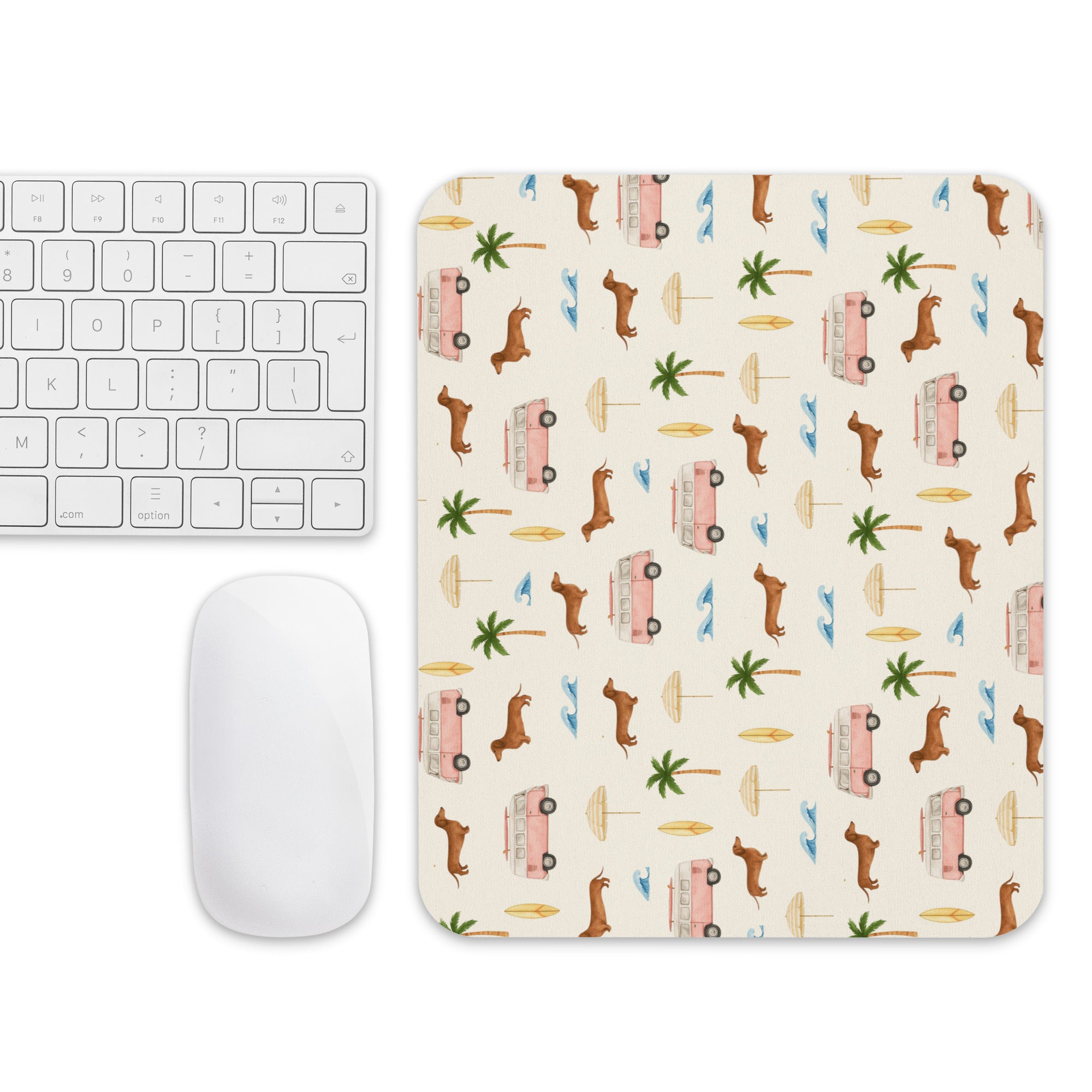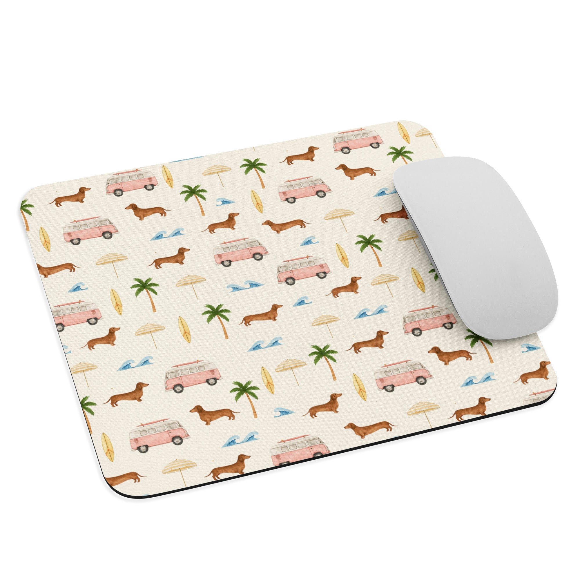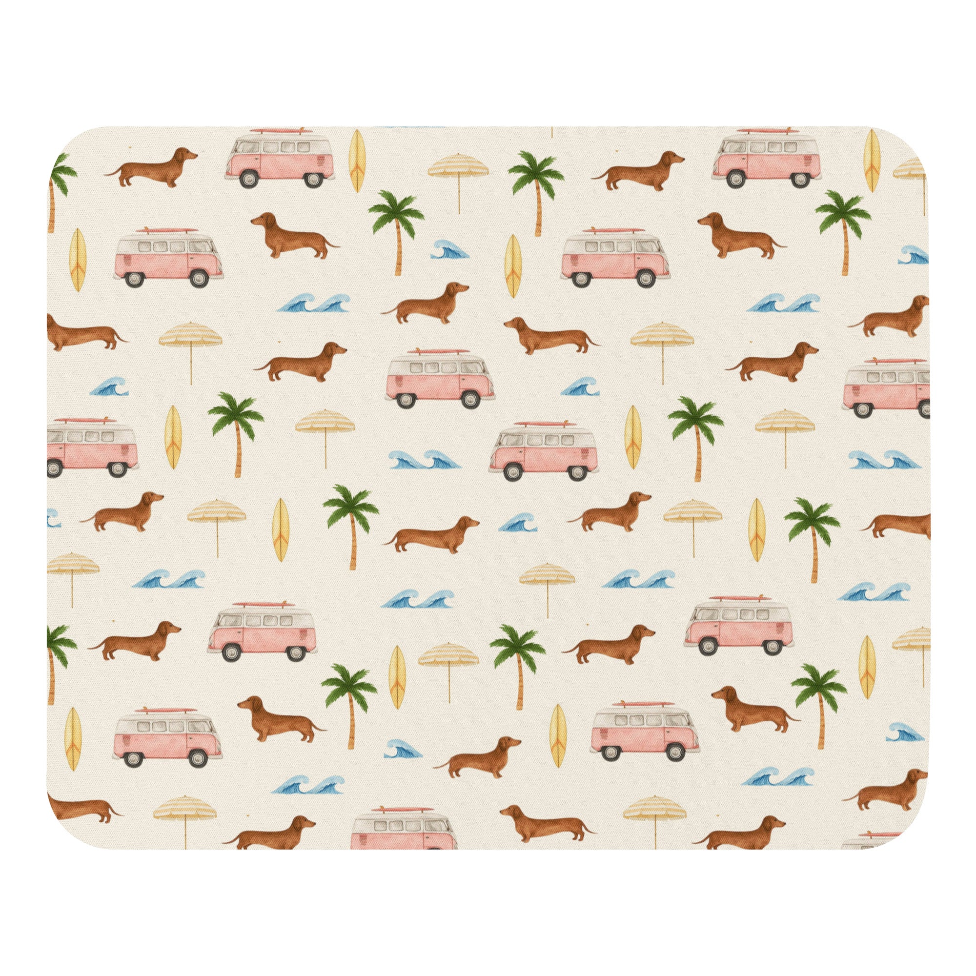 Every mouse deserves a smooth ride—and this one comes with sunshine, surf, and sausage dogs. The Beach Cruisin’ Wiener Dog mouse pad adds a splash of coastal charm to your workspace with its vibrant dachshund print featuring surf vans, palm trees, and waves.