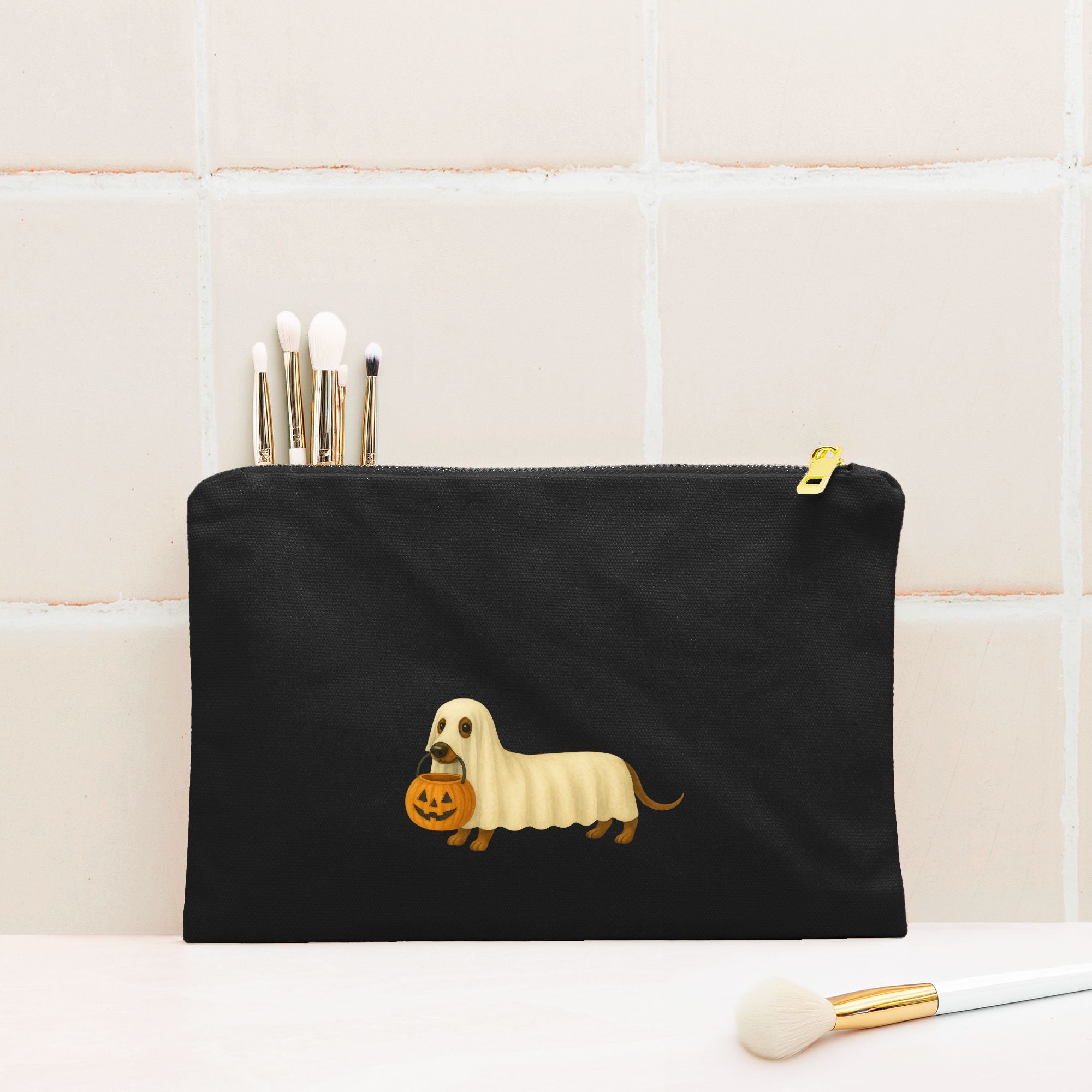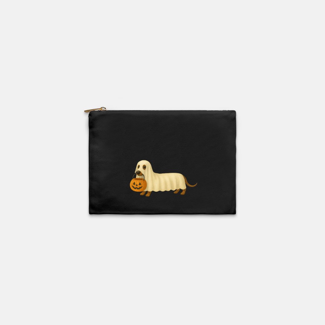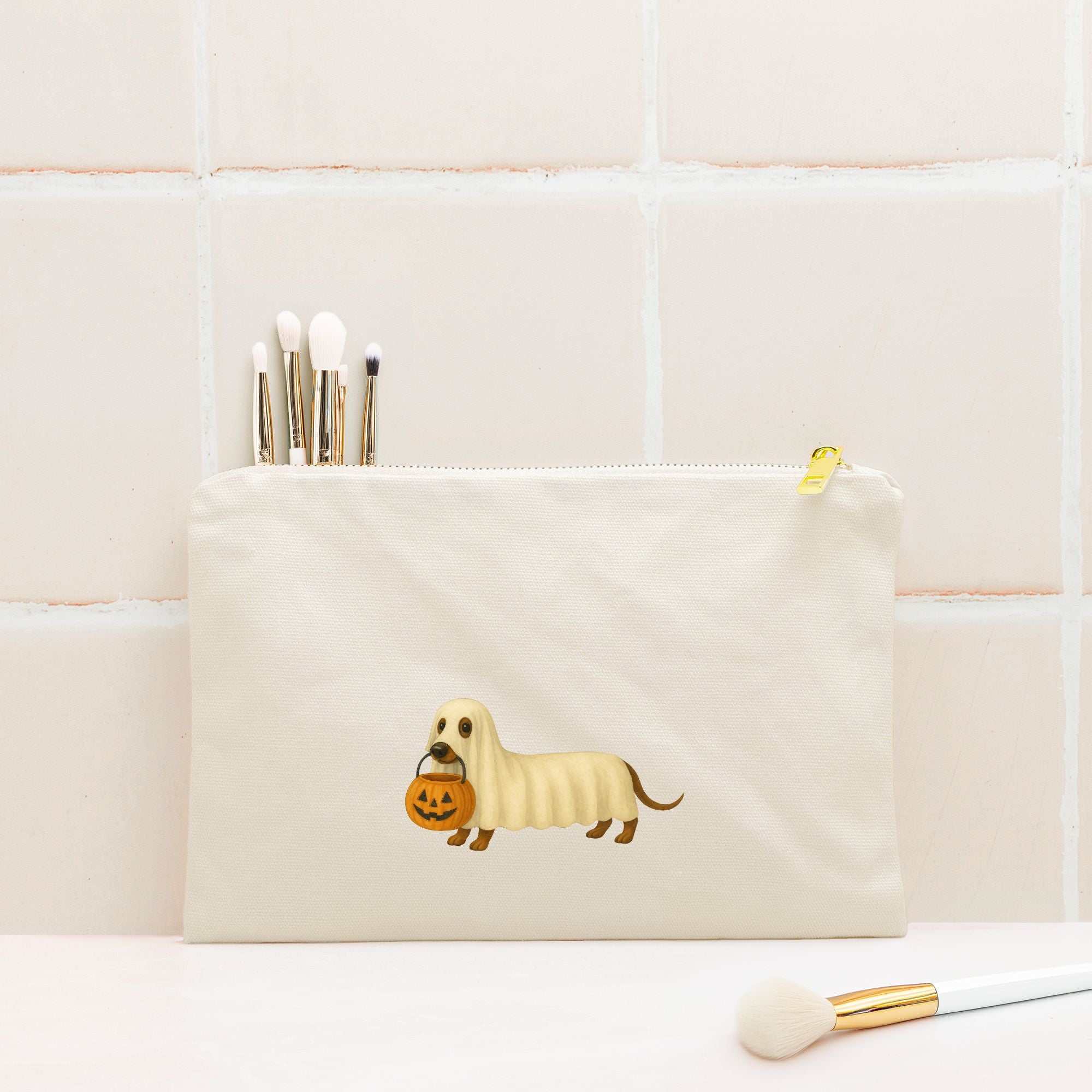 Elevate your Halloween spirit with our charming "Cosmetic Bag - Dachshund in Designer," a delightful addition to our Halloween 2025 collection. Designed with love for dog owners, this whimsical cosmetic bag showcases an adorable dachshund playfully dressed as a ghost, complete with a cheerful jack-o-lantern trick-or-treat bucket.