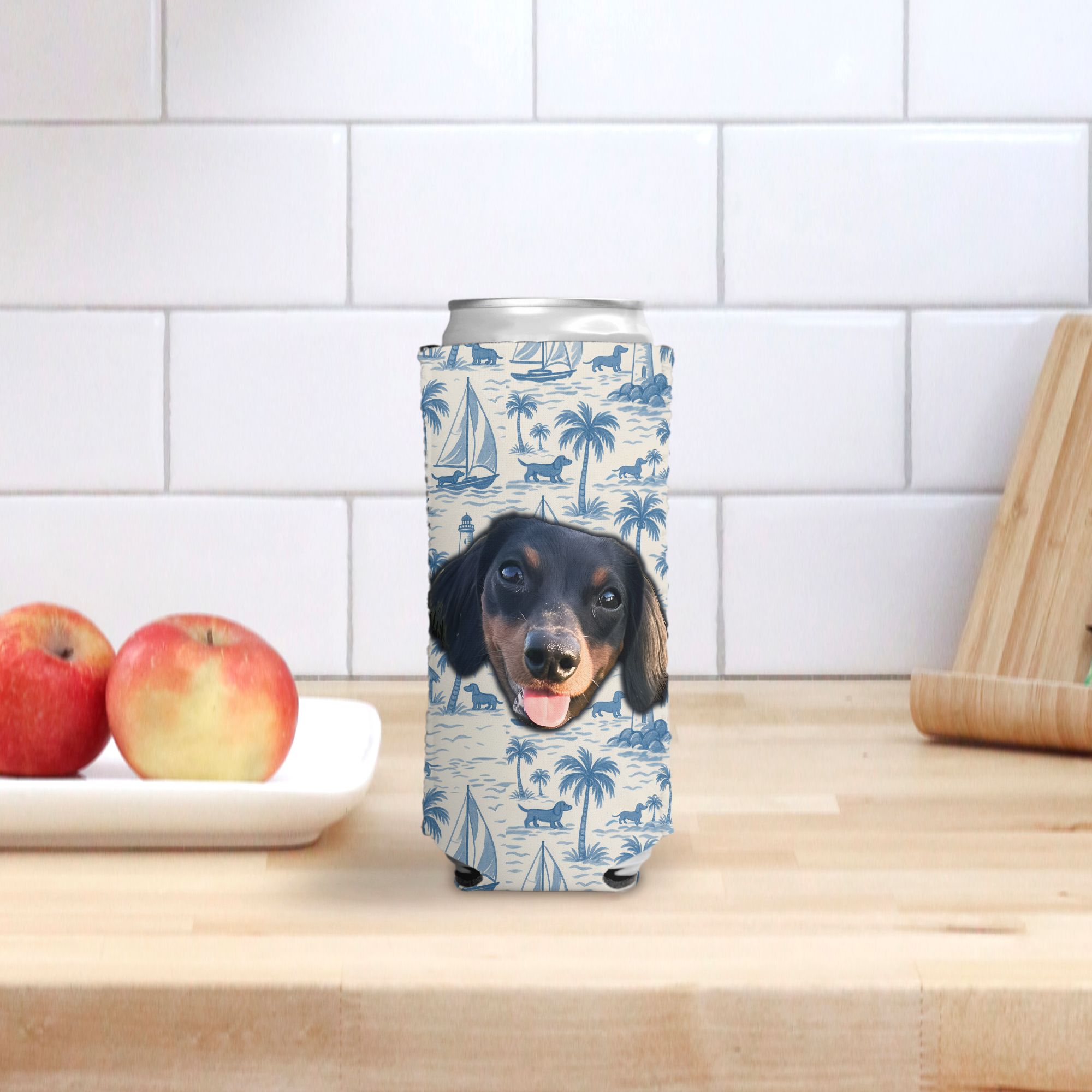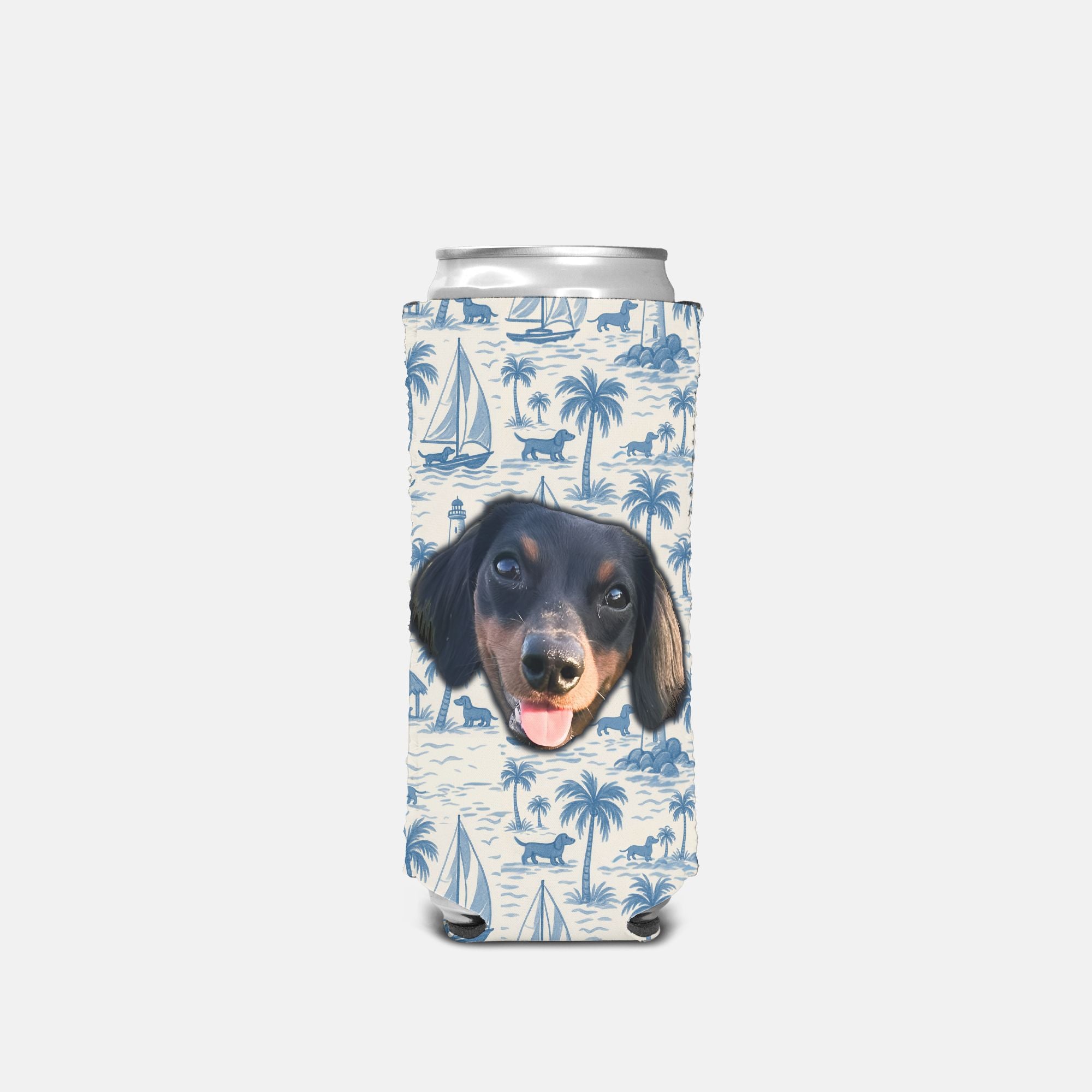 Keep your can cool and your doxie even cooler with our Coastal Doxie Toile Can Cooler. This cheeky coastal koozie features an all-over nautical dachshund print—complete with sailboats, lighthouses, palm trees, and your favorite sausage-shaped pups—plus a custom photo cutout to show off your dog’s adorable face.