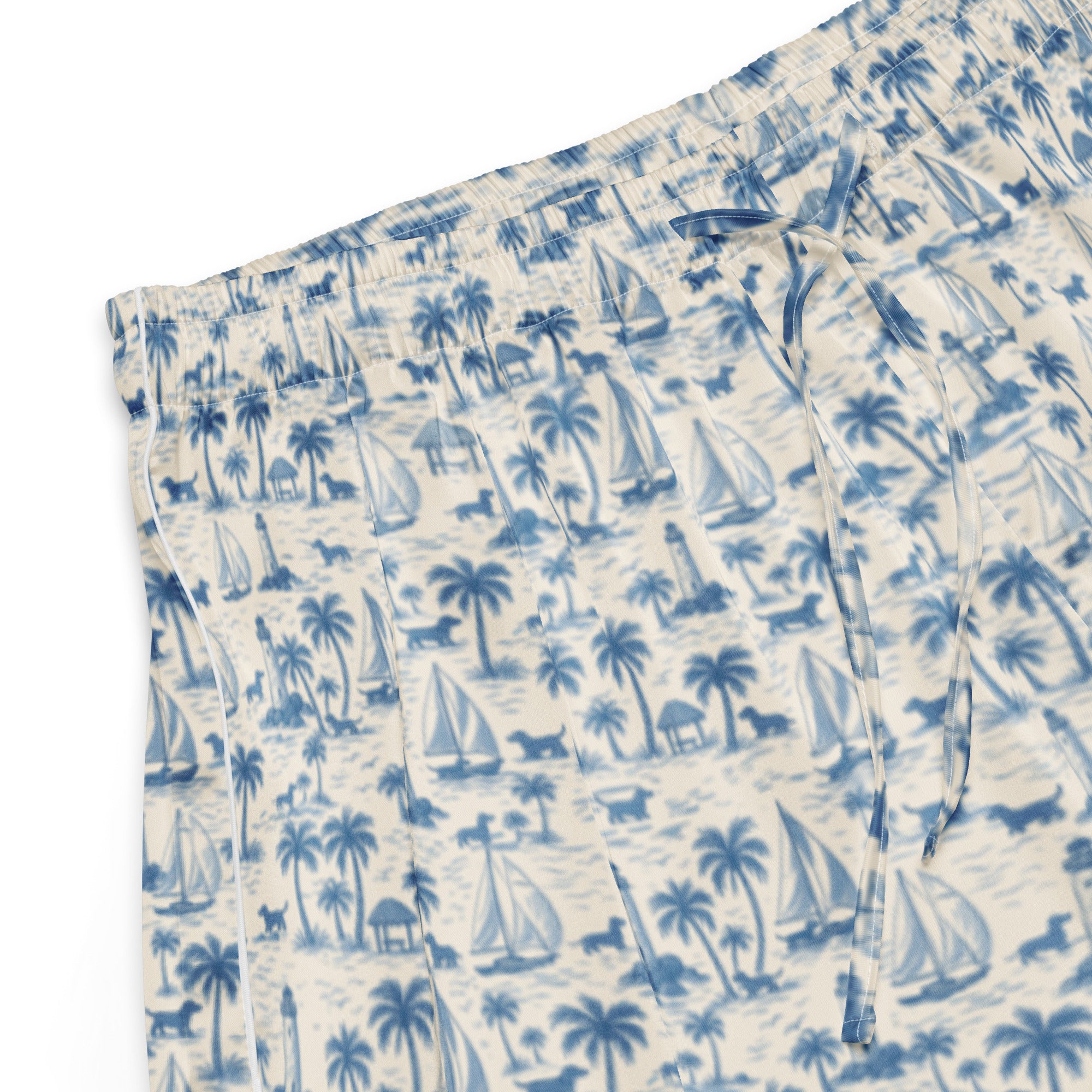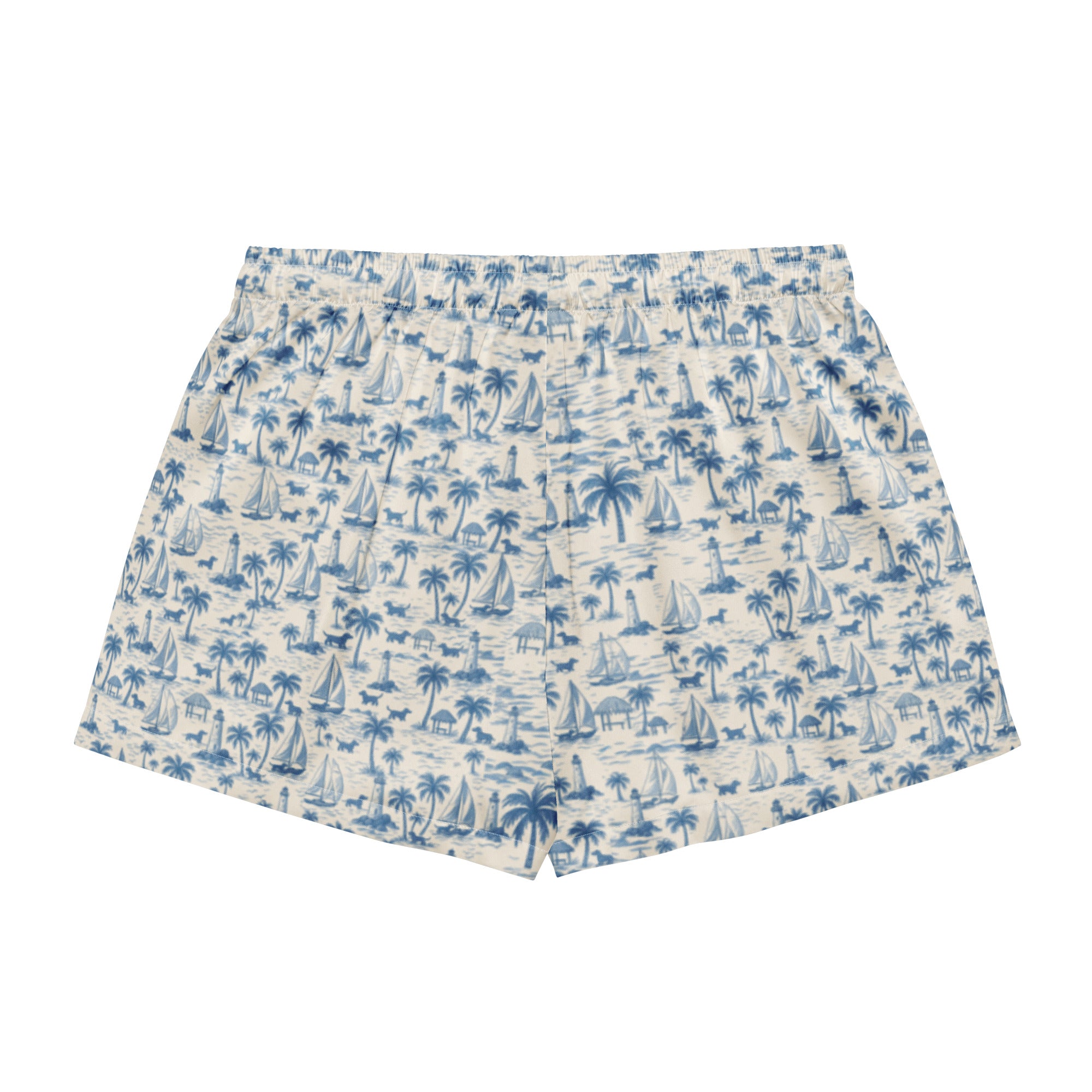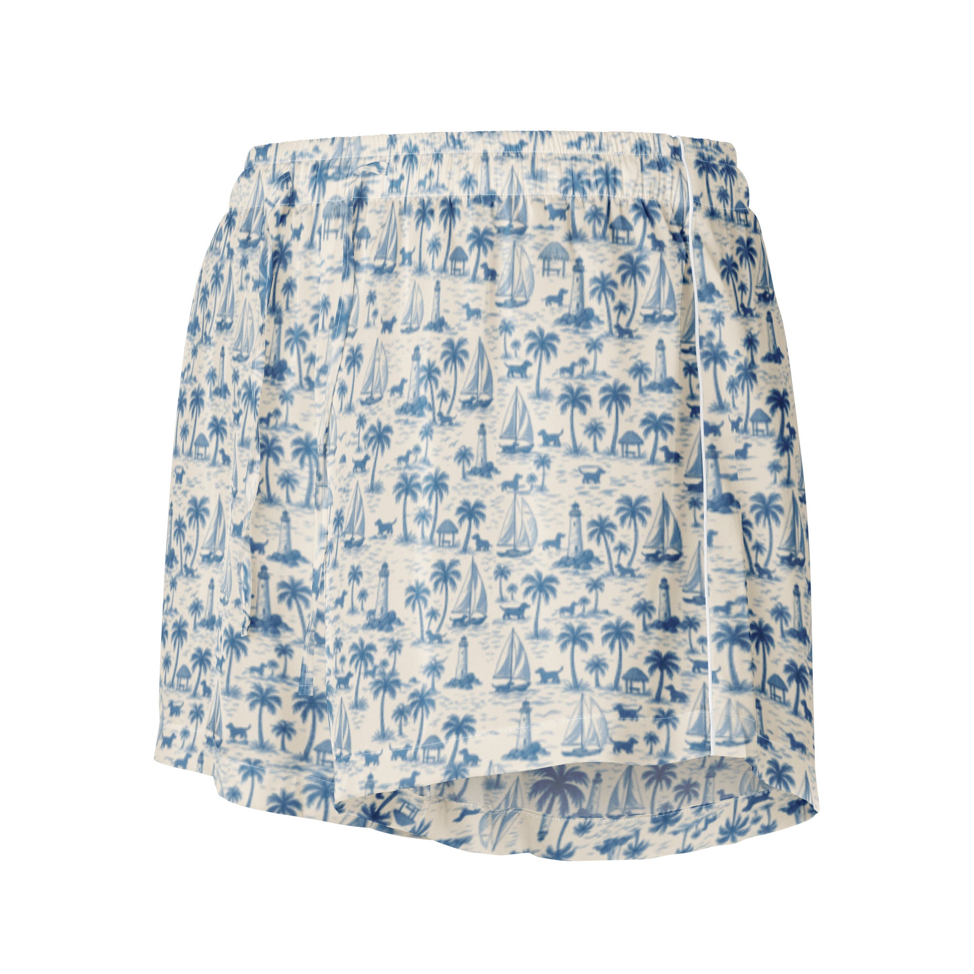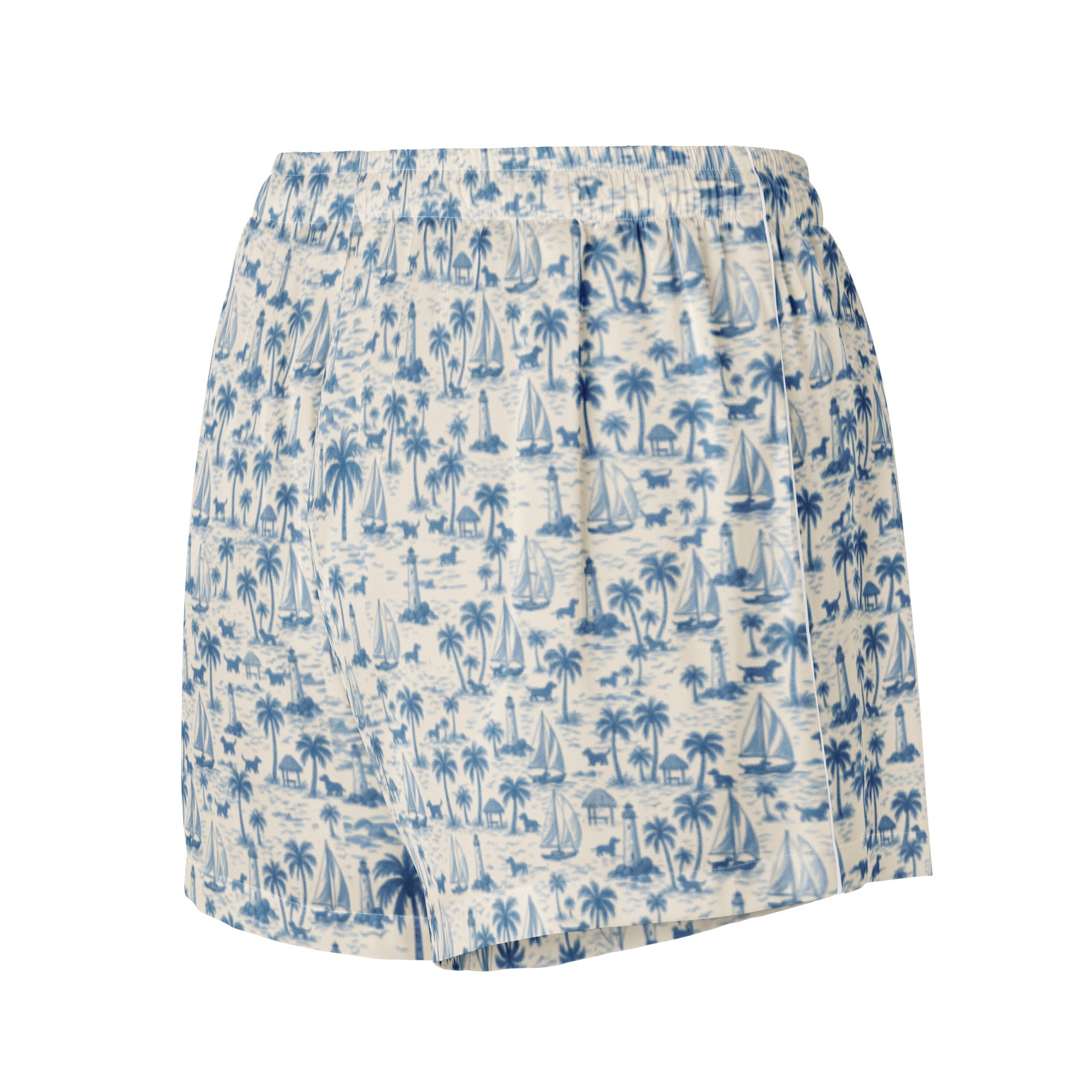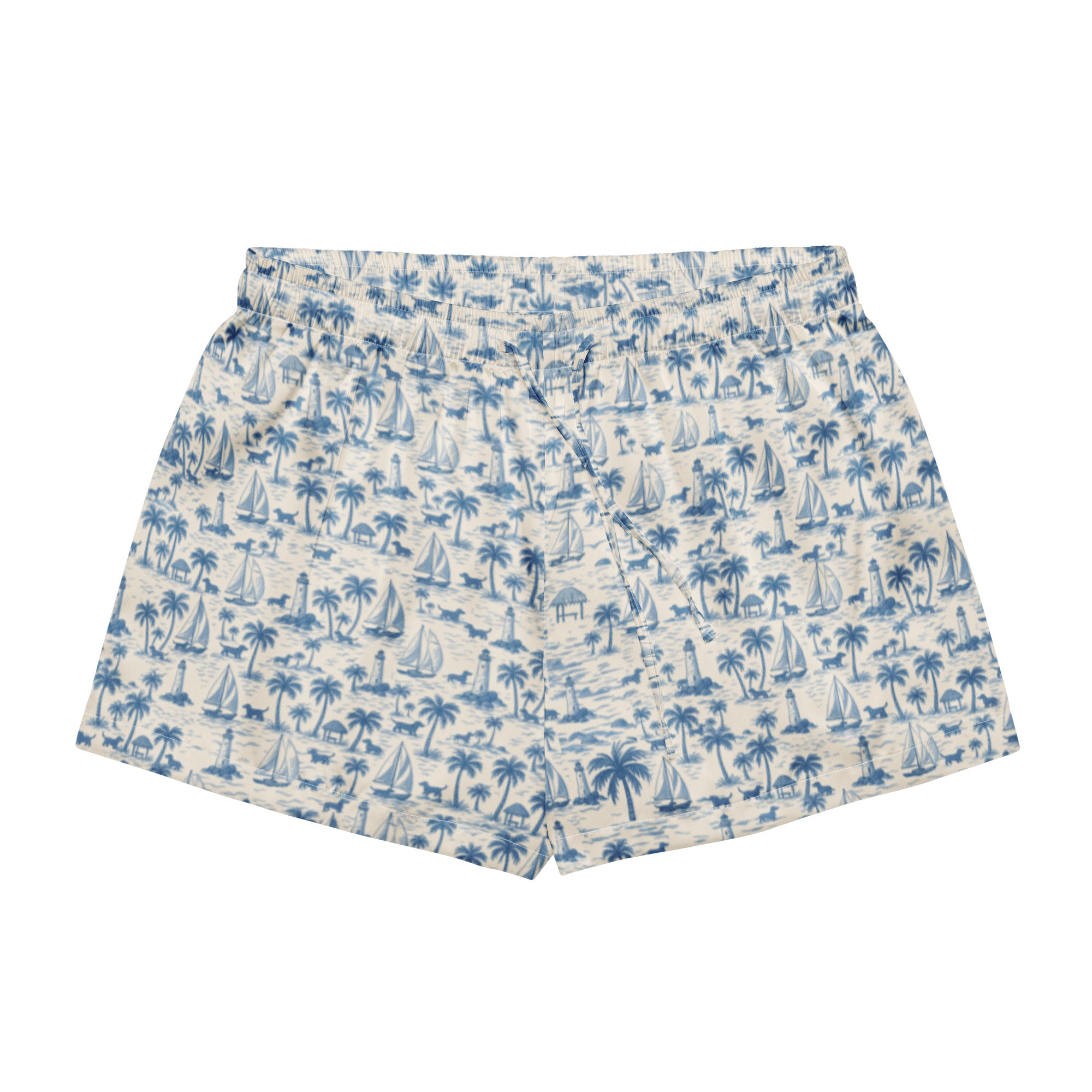Slip into seaside softness with our Coastal Doxie Toile Pajama Shorts—designed for dachshund lovers who know how to relax in style. These silky lounge shorts feature our signature nautical doxie print with sailboats, palm trees, and sausage dogs in a calming coastal palette of blue and white.