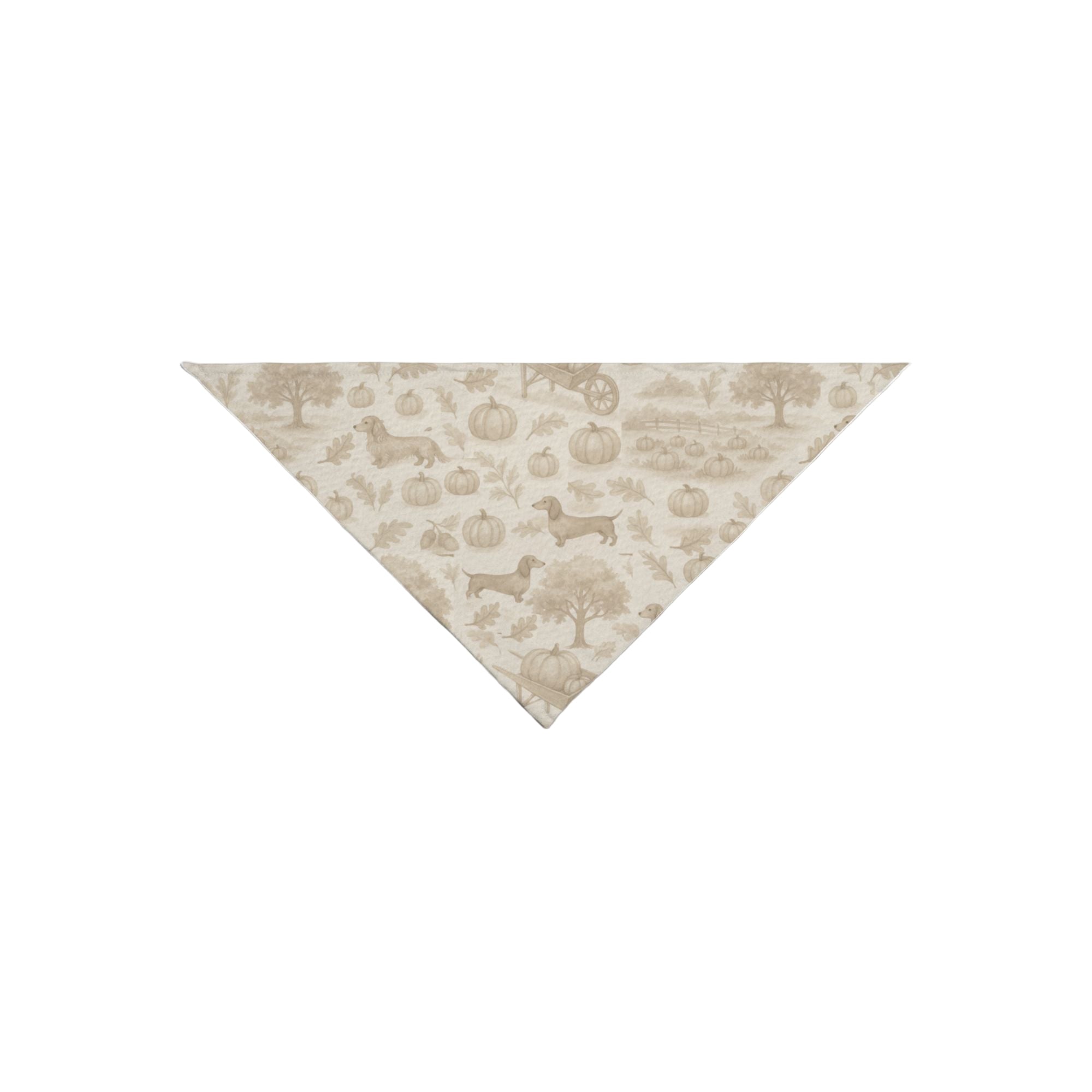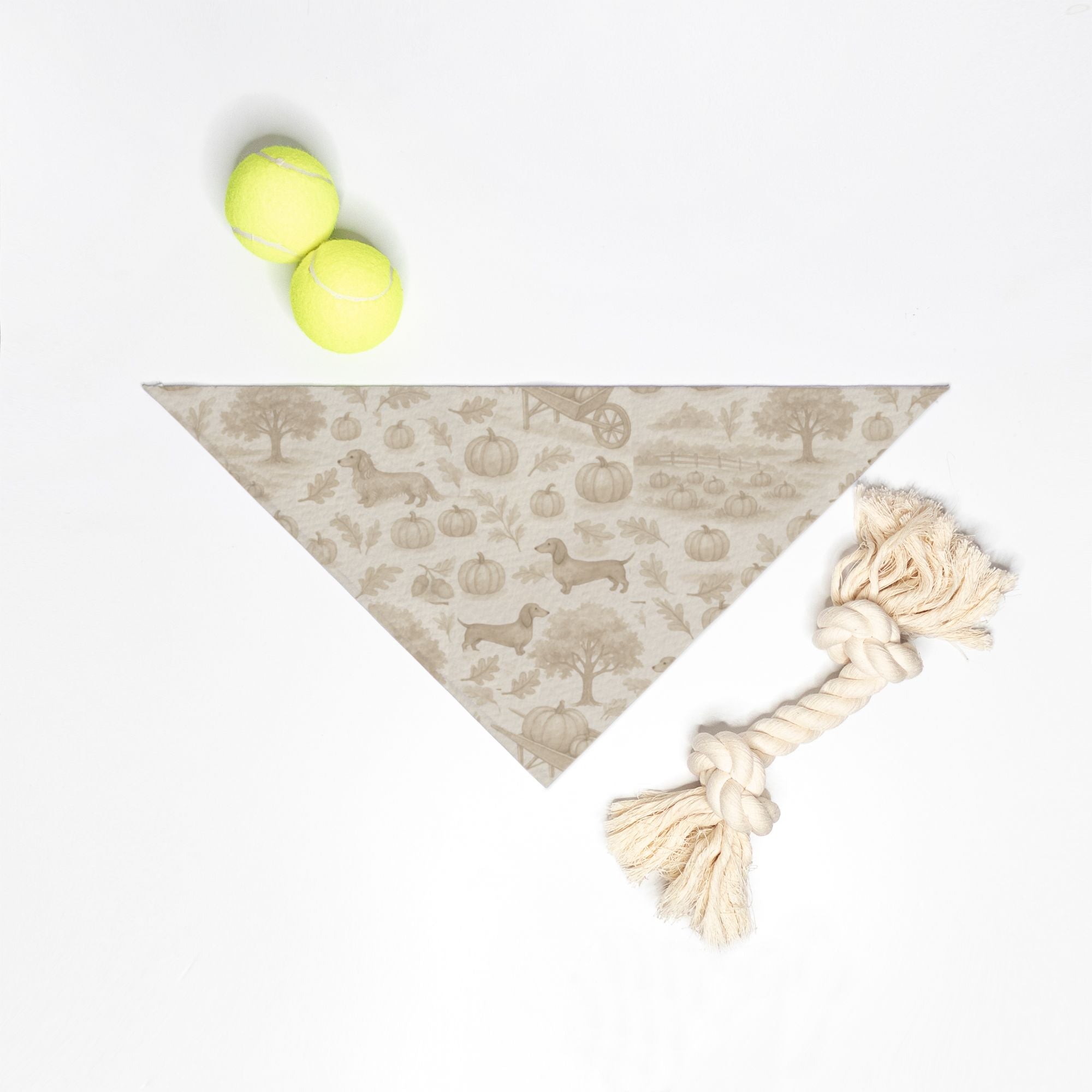 Wrap your darling dachshund in the spirit of autumn with our "Dachshund Tie On Bandana – Autumn Dachshund Toile." This charming accessory features a delightful subtle toile print that showcases our favorite pups amidst a pumpkin patch paradise, all beautifully rendered in a neutral color palette that blends seamlessly with the cozy vibes of the season. 🍂🎃