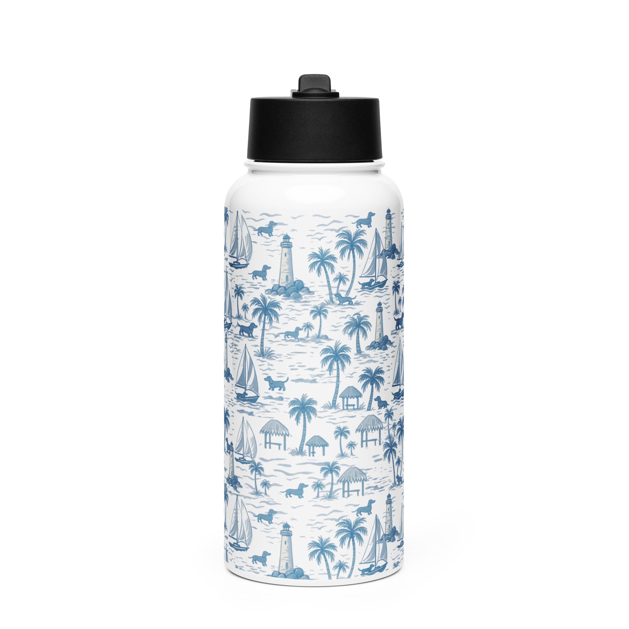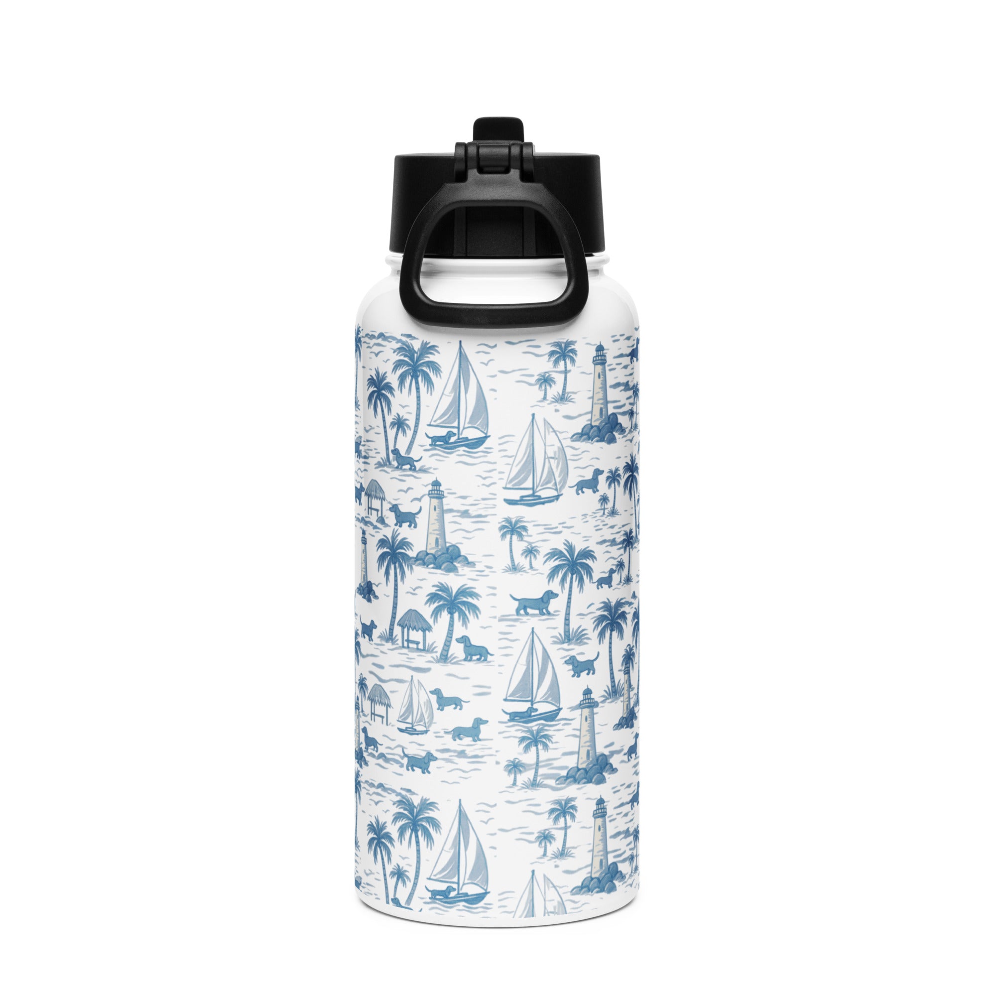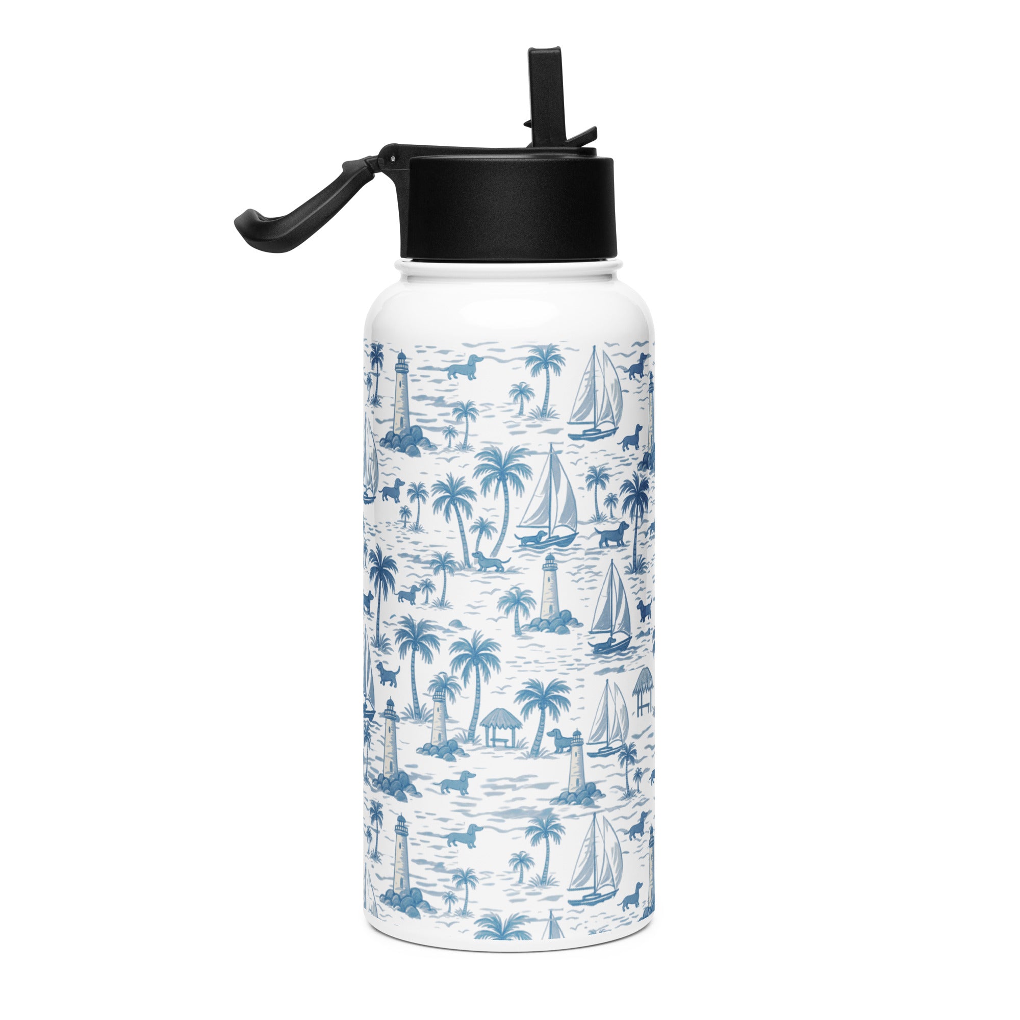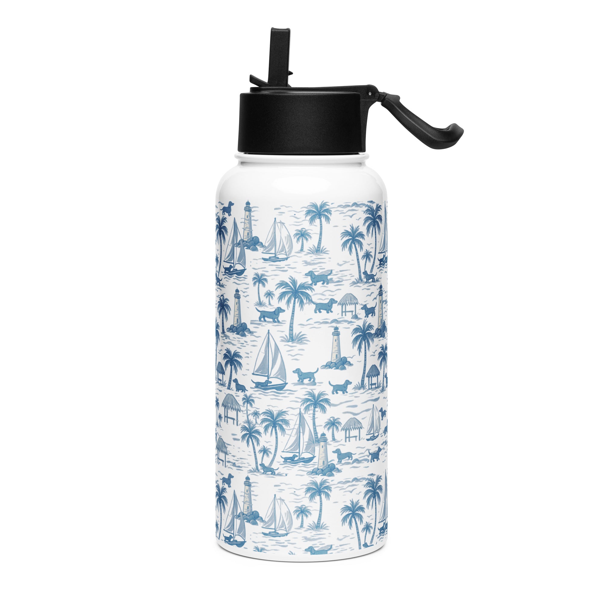 Hydrate with style and wiener dog charm using our Coastal Doxie Toile Water Bottle. Featuring an exclusive blue-and-white toile pattern of smooth, long-haired, and dapple dachshunds alongside palm trees, lighthouses, and sailboats, this bottle is your new go-to for dog walks, gym sessions, or beach days.