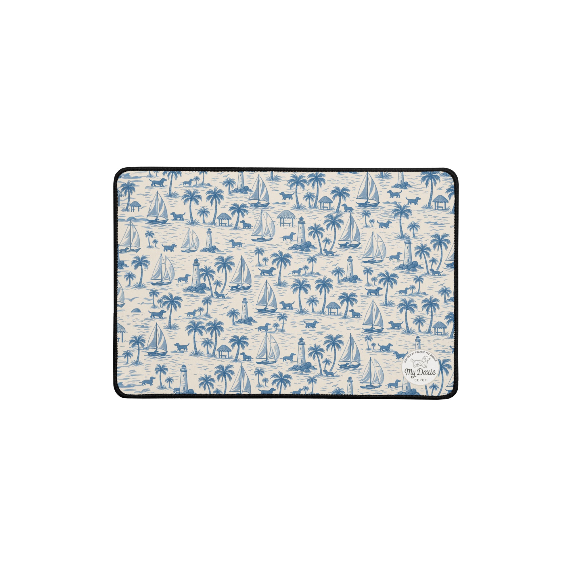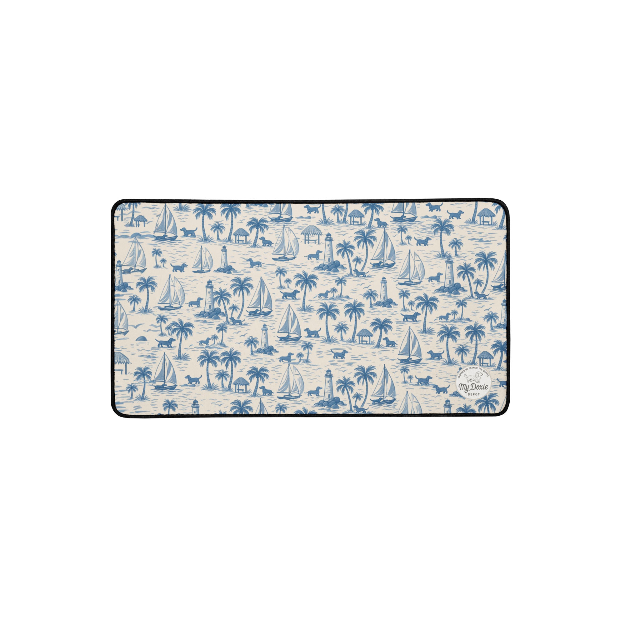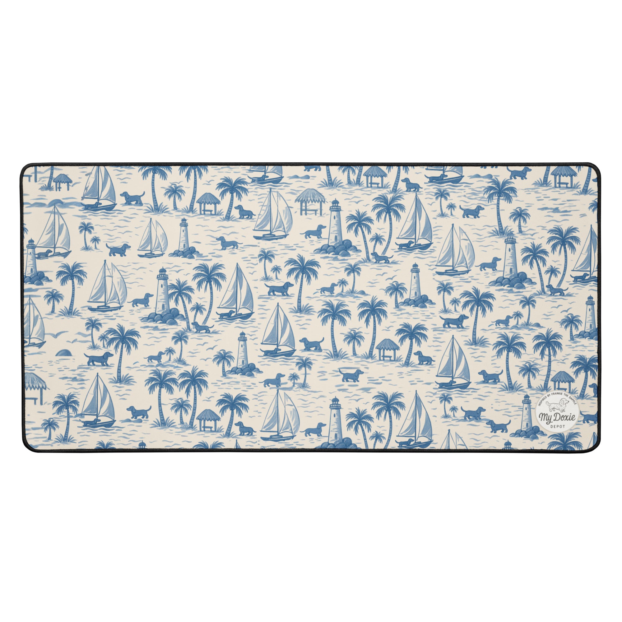 Turn your workspace into a coastal retreat with our Coastal Doxie Toile Desk Mat. Featuring an all-over nautical dachshund print with long-bodied pups, sailboats, palm trees, and lighthouses, this mat brings a preppy, seaside vibe to every desk setup.