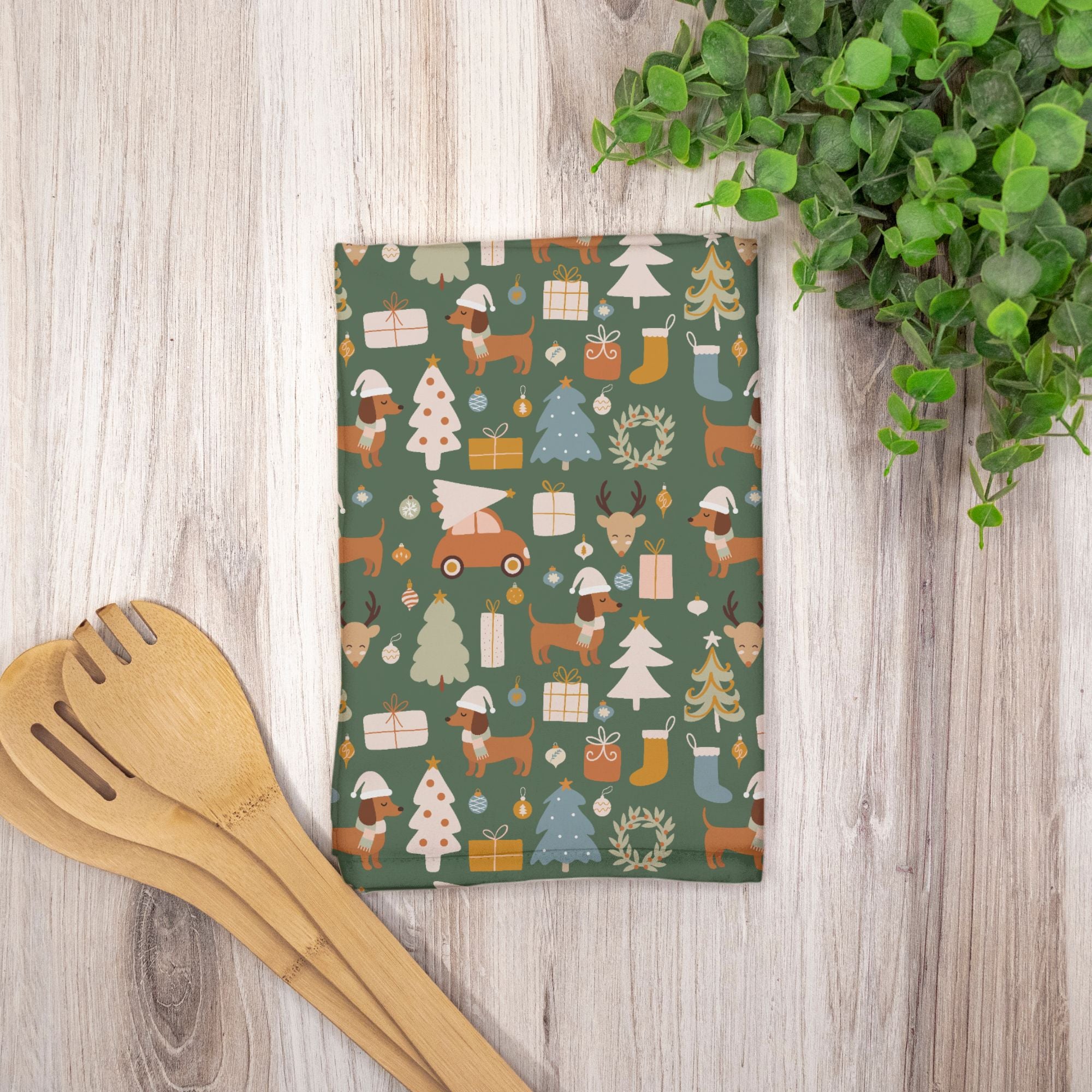 Bring a touch of timeless charm (and a wagging tail or two) to your holiday kitchen with our “Dachshund Holiday Wishes” Hostess Towel.