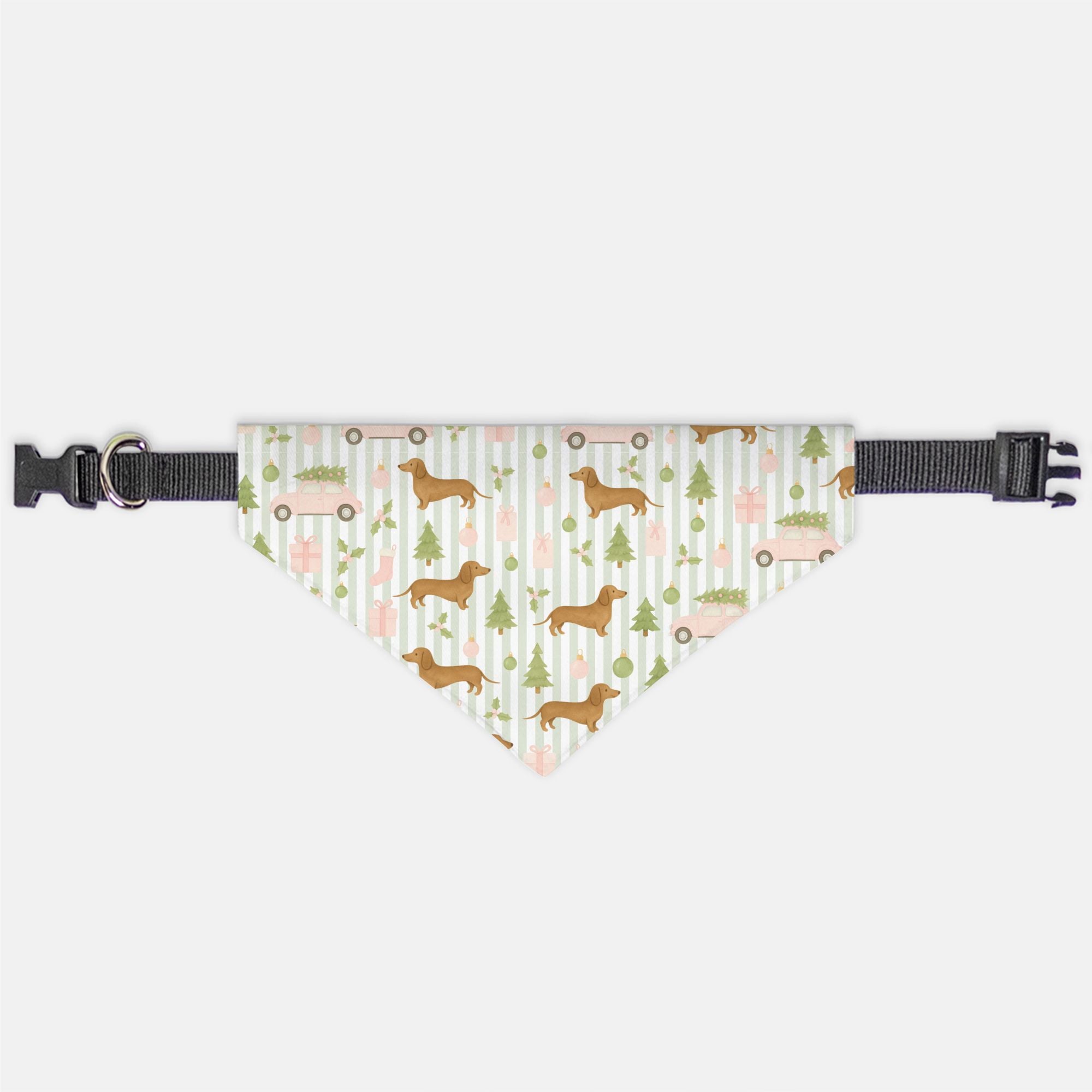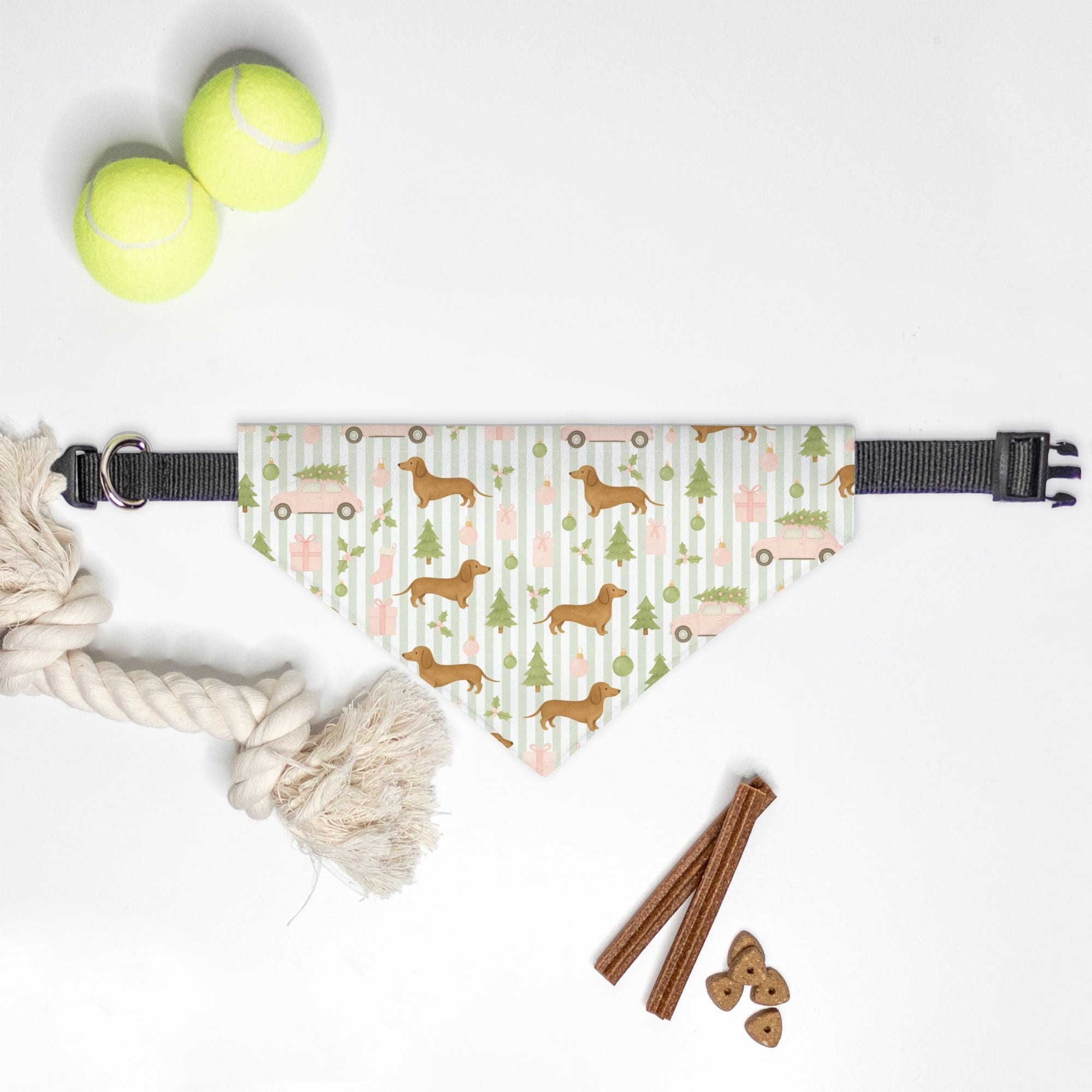 Bring a touch of festive charm to your pup's wardrobe with the On Collar Dog Bandana - Rustic Christmas Wiener Wonderland. This delightful accessory is designed for small and medium-sized dogs, ensuring that every dachshund has the perfect fit. Adorned with a charming mint green and white striped Christmas pattern, it showcases playful little dachshunds frolicking among rosy pink Christmas goodies. This bandana is a must-have for the holiday season, making your furry friend the star of any festive gathering. Crafted for comfort and style, it’s the ideal addition to your dog's holiday ensemble, celebrating Christmas 2025 in a way that reflects your love for your pet. Transform everyday walks into holiday showcases and spread cheer wherever you go with this delightful bandana. Perfect for dog owners looking to add a sprinkle of holiday magic to their pet's wardrobe!