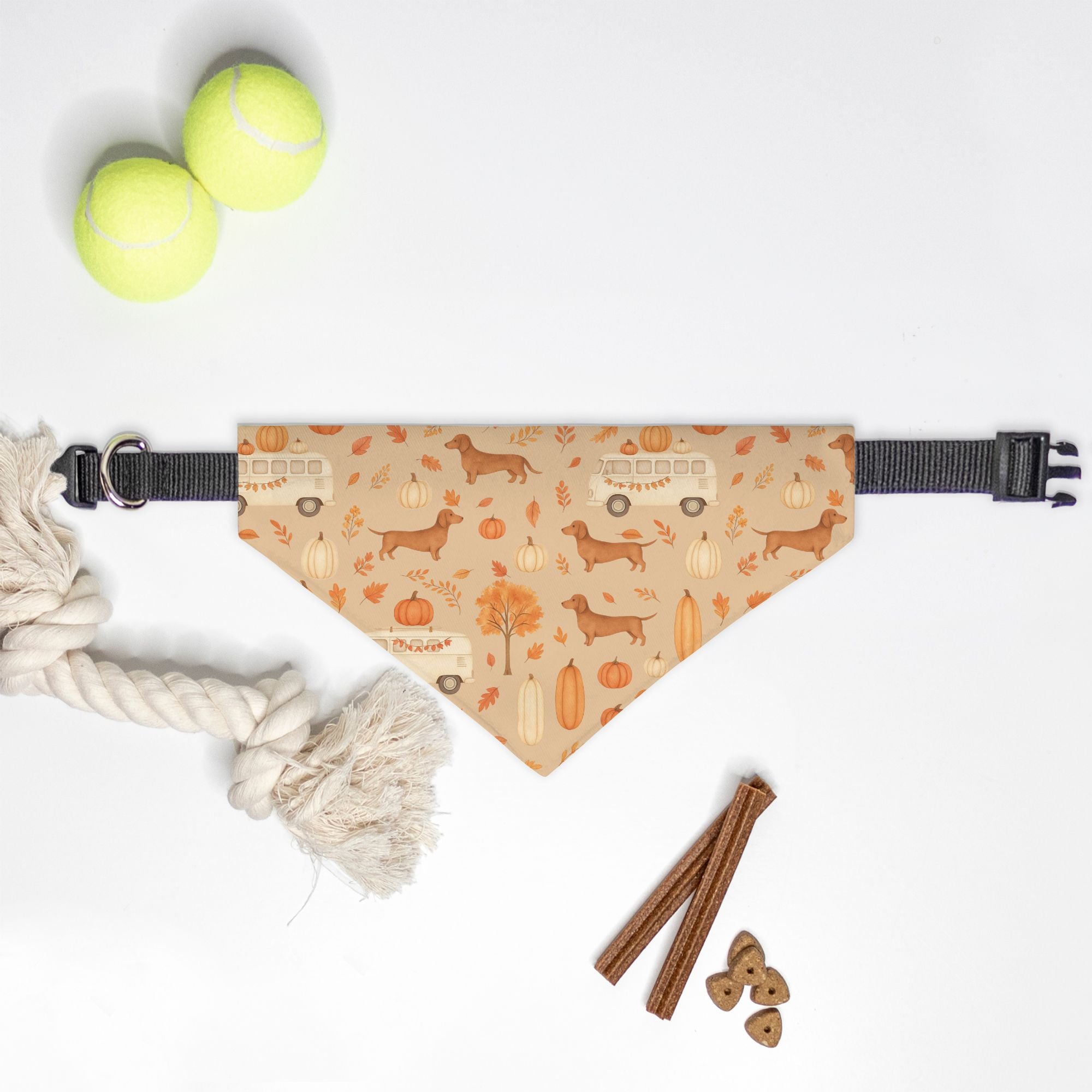 Get ready to take your pup on a whimsical journey this fall! Featuring an enchanting design that showcases a retro cream van cruising down a pumpkin-haired lane surrounded by vibrant autumn leaves, this bandana is a playful nod to road trips filled with laughter and love. The combination of cheerful dachshunds frolicking beside their whimsical ride is sure to make every autumn outing feel like a mini adventure! ๐๐