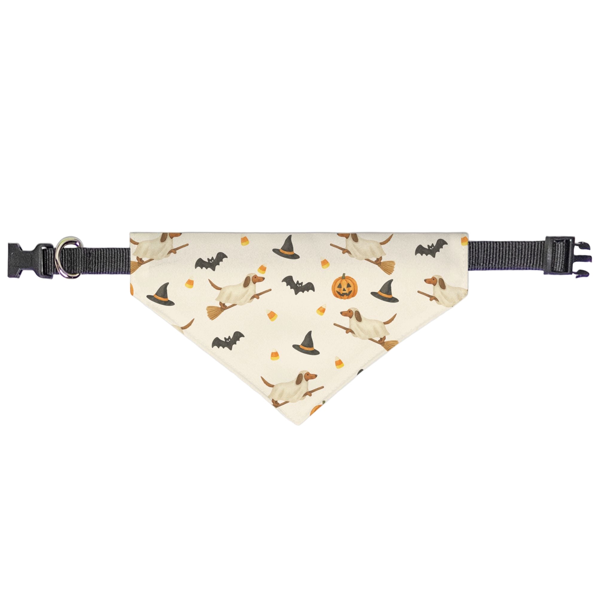 Get ready to unleash some Halloween cheer with our "On Collar Pet Bandana - Happy Halloweenie"! 🎃 This enchanting bandana is perfect for your fabulous fur baby, featuring an irresistibly adorable dachshund dressed up as a ghost, complete with a delightful jack-o-lantern trick-or-treat bucket. It's a charming twist that will have everyone asking, "Where did you get that cute accessory?"