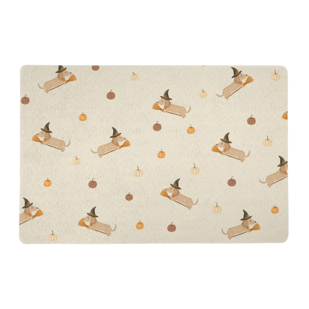 Embrace the whimsical charm of fall with our Pet Grub Mat - Autumn Dachshund Magic! 🐾 This enchanting mat features delightful dachshunds dressed as playful witches, soaring on broomsticks, complete with adorable witch hats and festive pumpkins. 🍂 Perfect for Thanksgiving gatherings and cozy fall afternoons, this mat adds a splash of seasonal spirit to your pet's dining area.