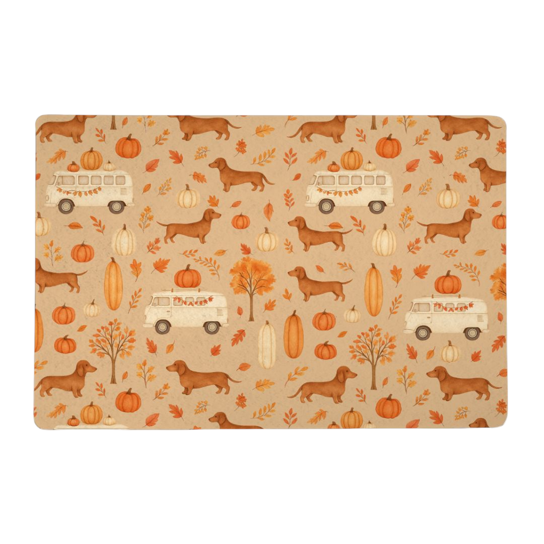 Introducing the charming Pet Grub Mat - Dachshund Harvest Road Trip – Fall Festival Print, your furry friend's new favorite dining companion! This delightful mat features an adorable dachshund embarking on a whimsical road trip, cruising in a retro cream van surrounded by an autumnal wonderland of colorful leaves and cheerful pumpkins. 🌟🍂🚐