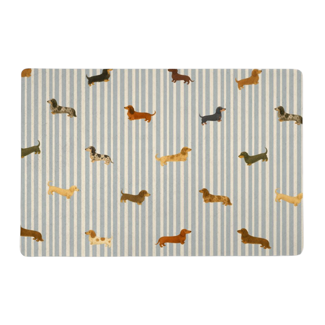 Introducing the Pet Grub Mat - Long-Haired & Short-Haired Dachshund Mix Print! 🐾 Transform mealtime for your furry friend with this whimsical and charming mat that perfectly captures the essence of your beloved dachshund. Adorned with a delightful blue and white vintage stripe pattern, it showcases a cheerful mix of long-haired and smooth-haired dachshunds, each featuring a variety of stunning colors, including creams, dapples, wire-haired, pie-bald, black and cream, and brown and cream! 🌈