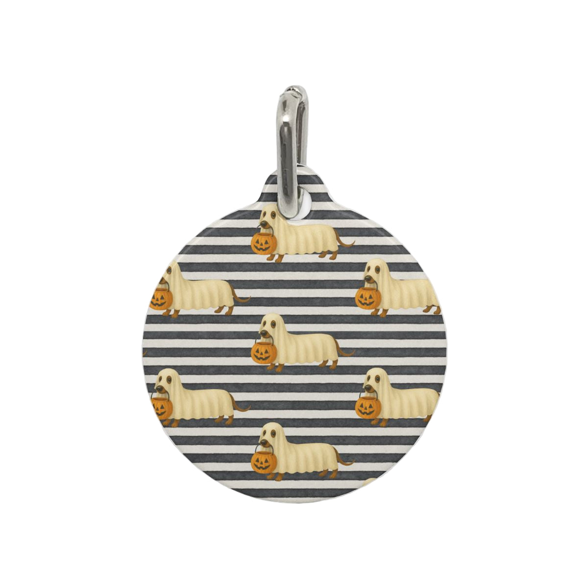 Introducing the "Pet Tag - Boo Crew: Wiener Dog Edition," the perfect accessory for your beloved dachshund this Halloween season. Adorned with an enchanting repeating pattern, this tag showcases playful cartoon-style dachshunds dressed as whimsical ghosts, each one holding a spooky jack-o-lantern treat bucket. Set against bold black and white horizontal stripes, it captures a delightful coastal-meets-spooky Halloween vibe that every dachshund mom will adore. Ideal for doxie lovers and fans of sausage dogs, this charming design is sure to bring joy through fall festivities and makes for a thoughtful gift for dachshund owners. Whether you have a mini dachshund, a long-haired dachshund, or a spirited dachshund puppy, this tag is a must-have for all dog lovers. Celebrate Halloween 2025 in style with our festive pet tag, bringing a splash of fun to your dog’s collar and making it a perfect addition to your Halloween dachshund decor.