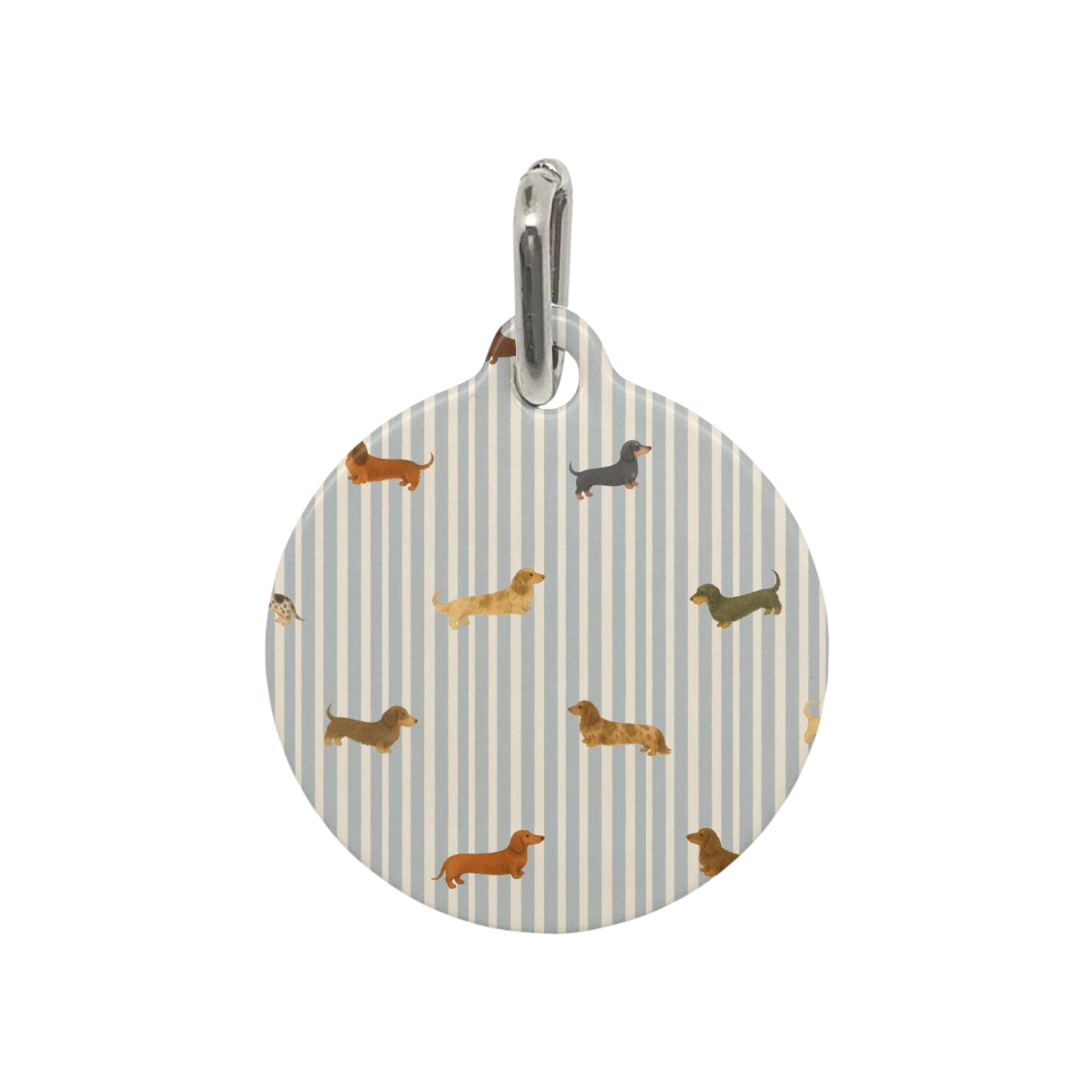 Introducing the delightful Pet Tag - Long-Haired & Short-Haired Dachshund Mix Print, a charming accessory that captures the essence of your beloved dachshund! 🎉 Designed with a stunning blue and white vintage stripe pattern, this pet tag is sprinkled with adorable prints of long-haired and smooth-haired dachshunds, showcasing a delightful mix of all their enchanting colors—creams, dapples, wire-haired, pie-bald, black and cream, and brown and cream! 🐾