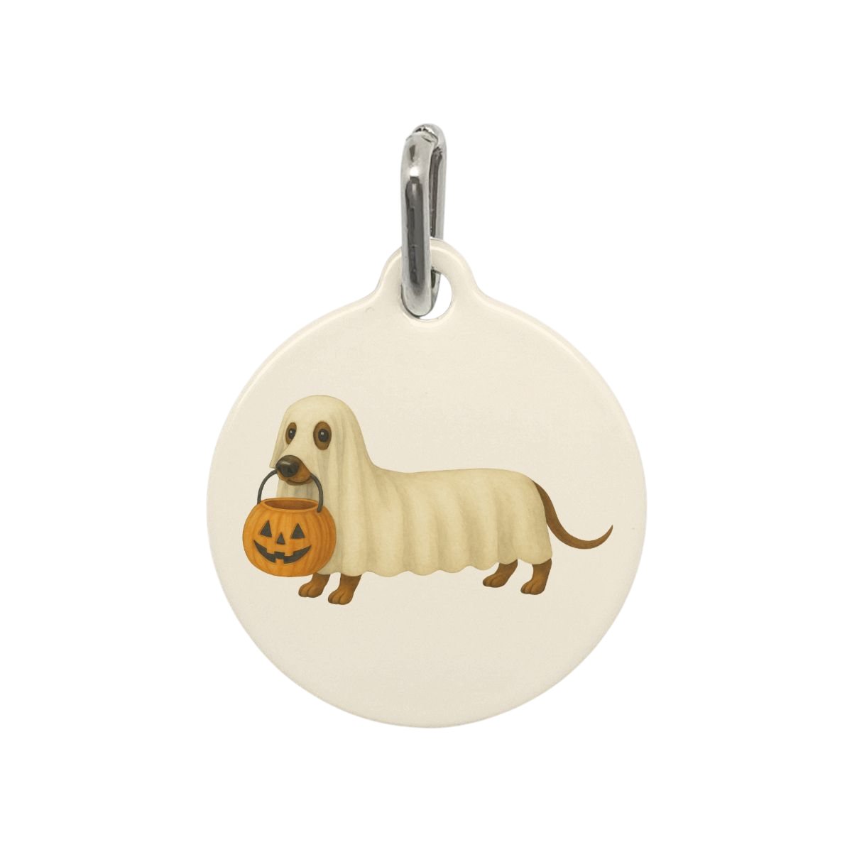 Celebrate the spookiest season of the year with our enchanting "Pet Tag - Spooky Sausage: Halloween Dachshund"! This delightful pet tag captures the spirit of Halloween with a whimsical design featuring an adorable dachshund dressed up as a friendly ghost, merrily carrying a jack-o-lantern trick-or-treat bucket. 🍬👻