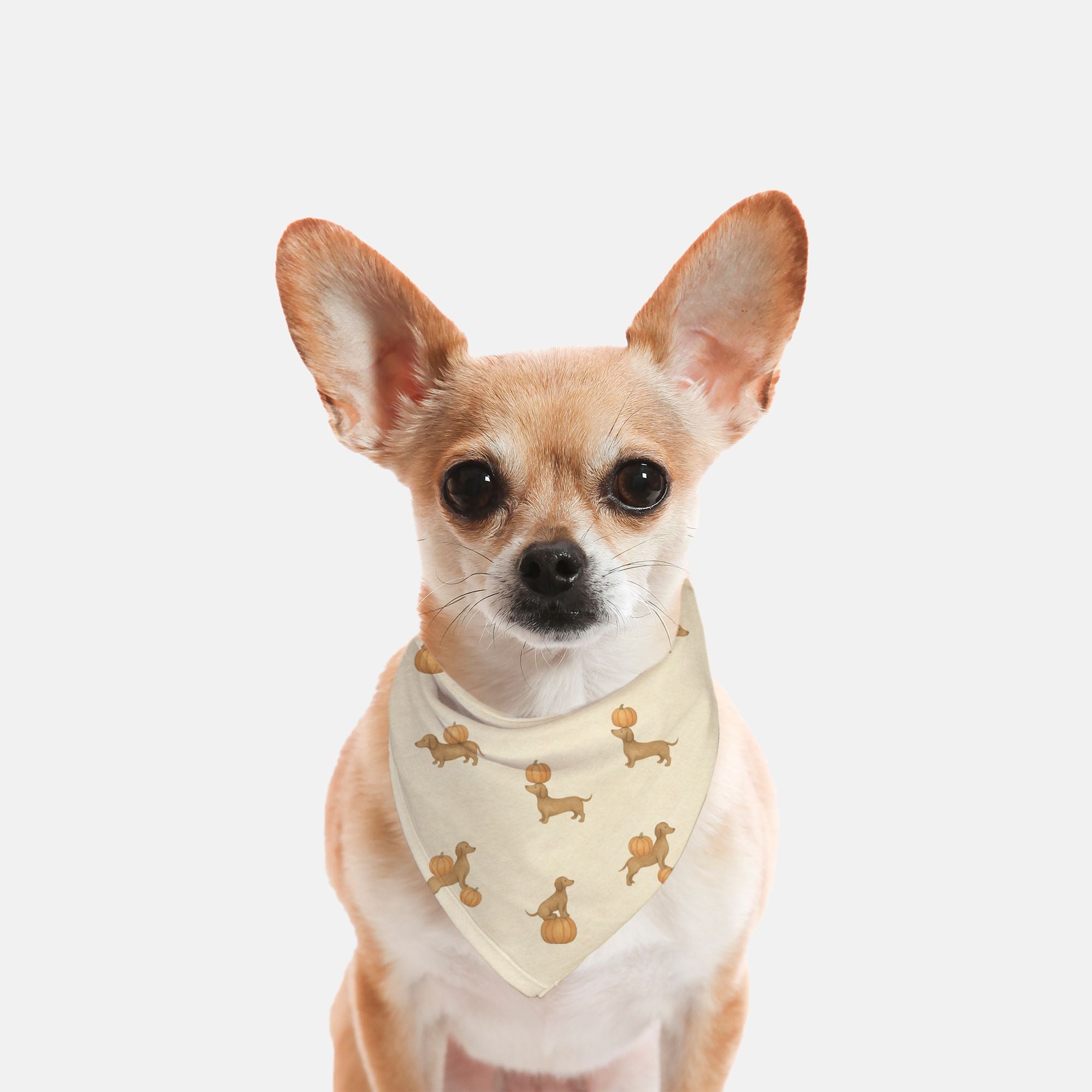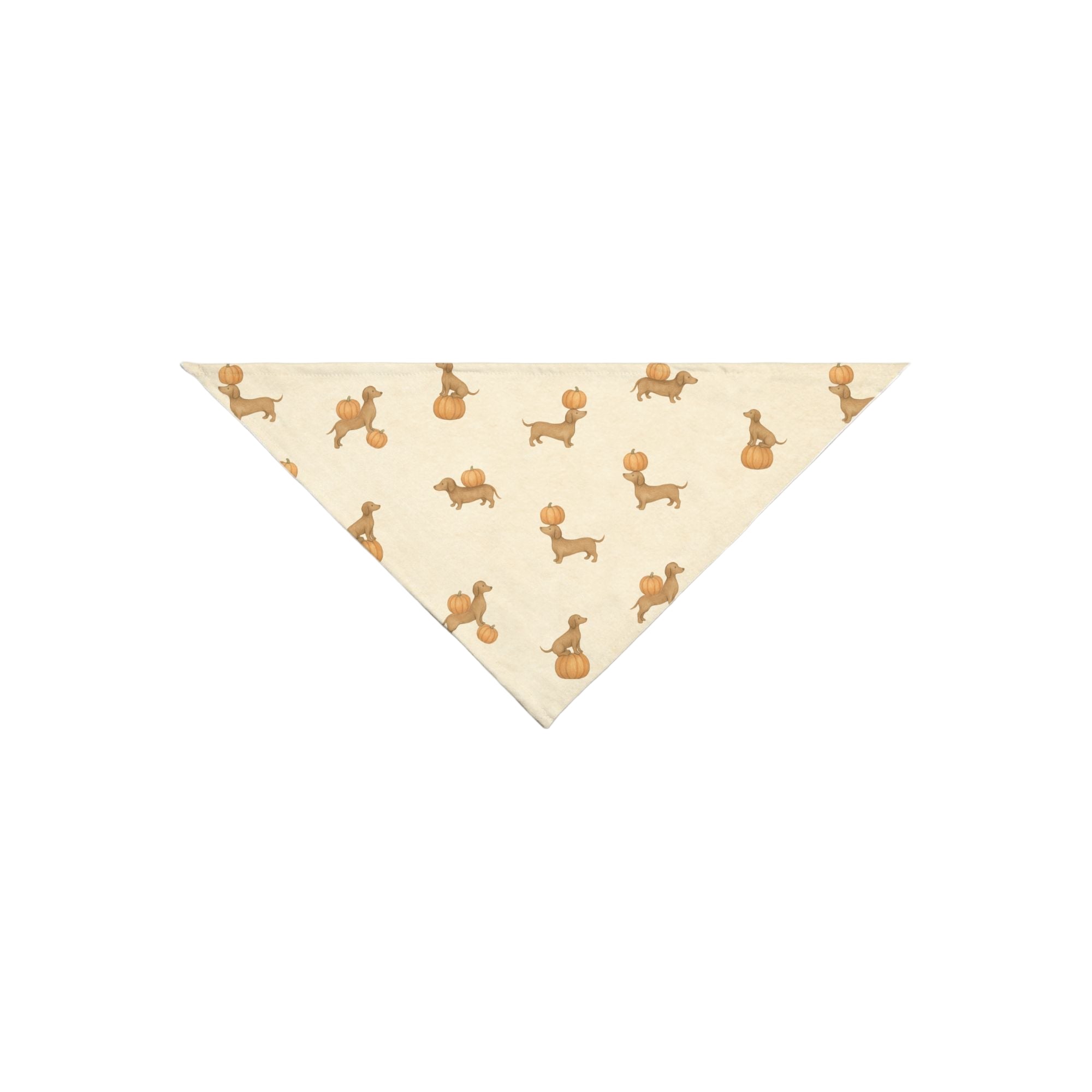 This cozy fall pattern features playful dachshunds in rich autumn tones balancing pumpkins, sniffing squash, and trotting joyfully across a soft cream background. Each doxie is illustrated in a charming hand-painted watercolor style with subtle vintage shading and boutique whimsy. The design evokes the warmth of pumpkin season and captures the personality of these long-bodied cuties in motion. Perfect for fall dog bandanas, seasonal pet accessories, baby blankets, and home décor, this seamless repeat is a festive favorite for dachshund lovers and coastal dog moms alike.
