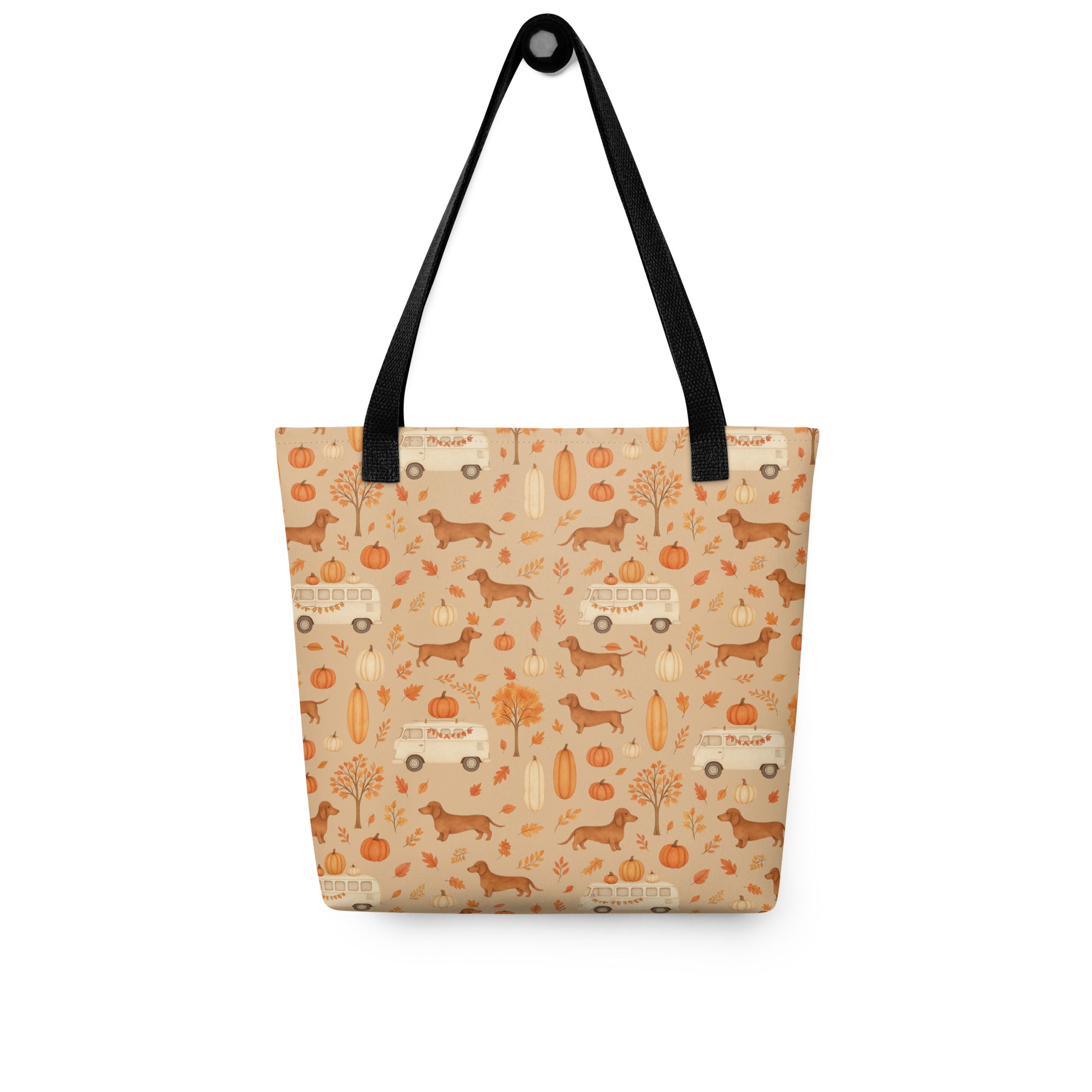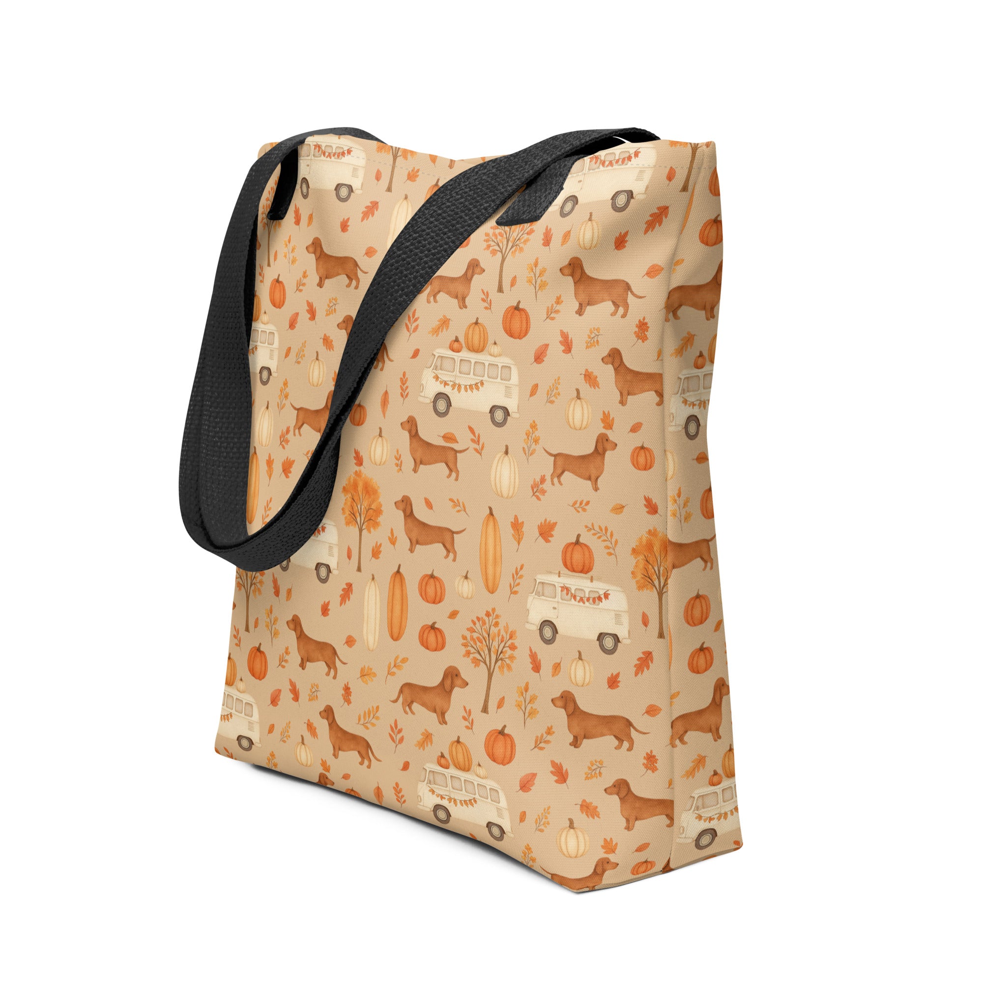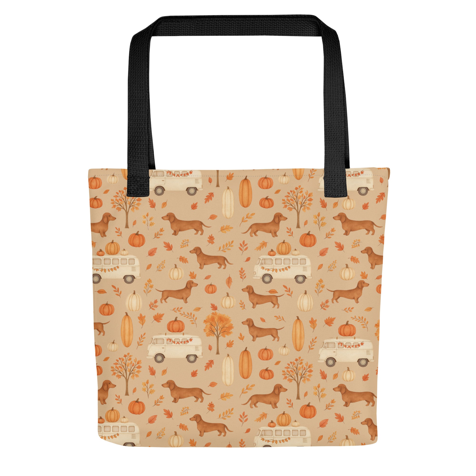 Celebrate autumn adventures with this playful tote bag featuring dachshunds, pumpkins, retro white vans, and crisp fall leaves. Perfect for dachshund lovers who want to carry a little harvest festival spirit wherever they go. This charming design captures all the cozy vibes of pumpkin season and road trip fun in one stylish, practical accessory.