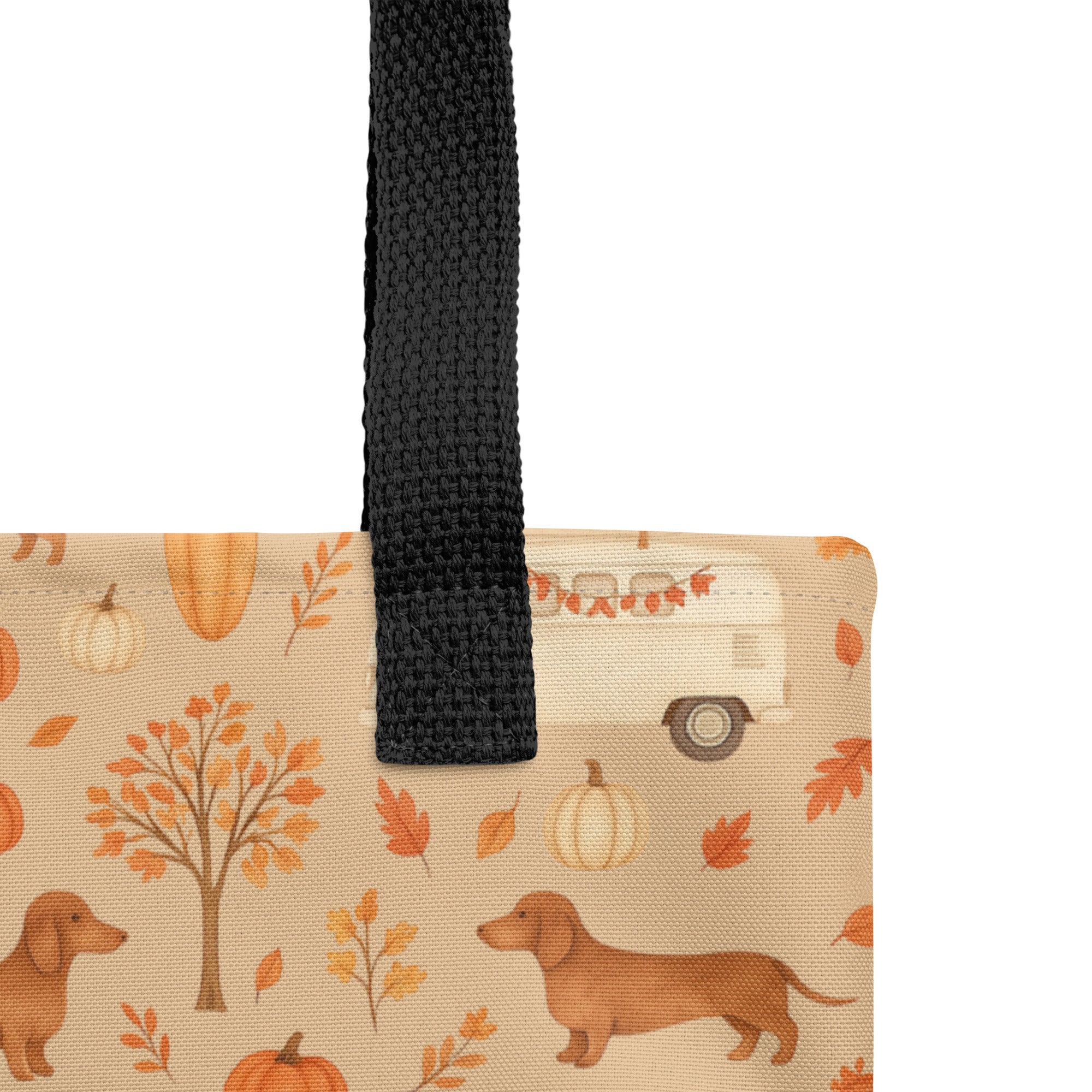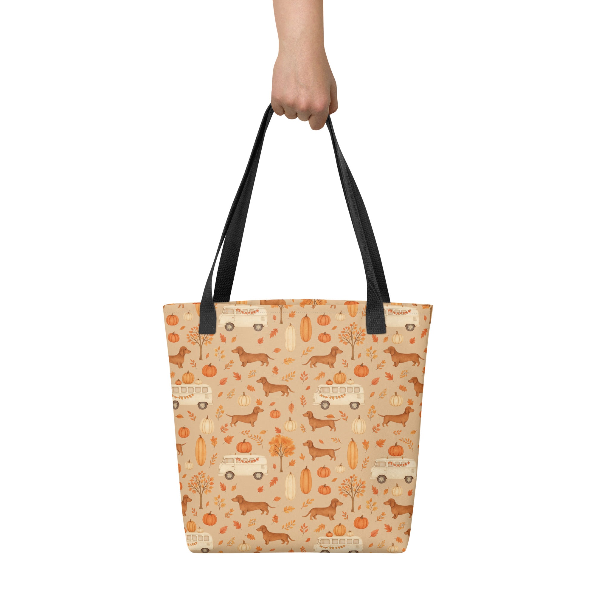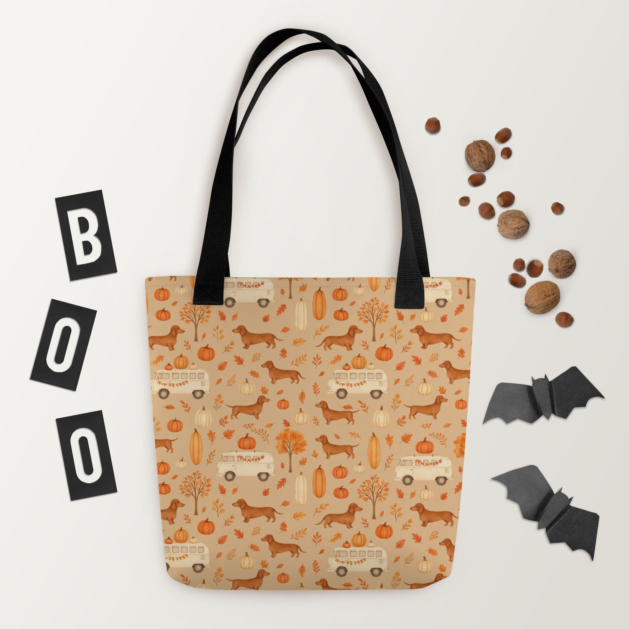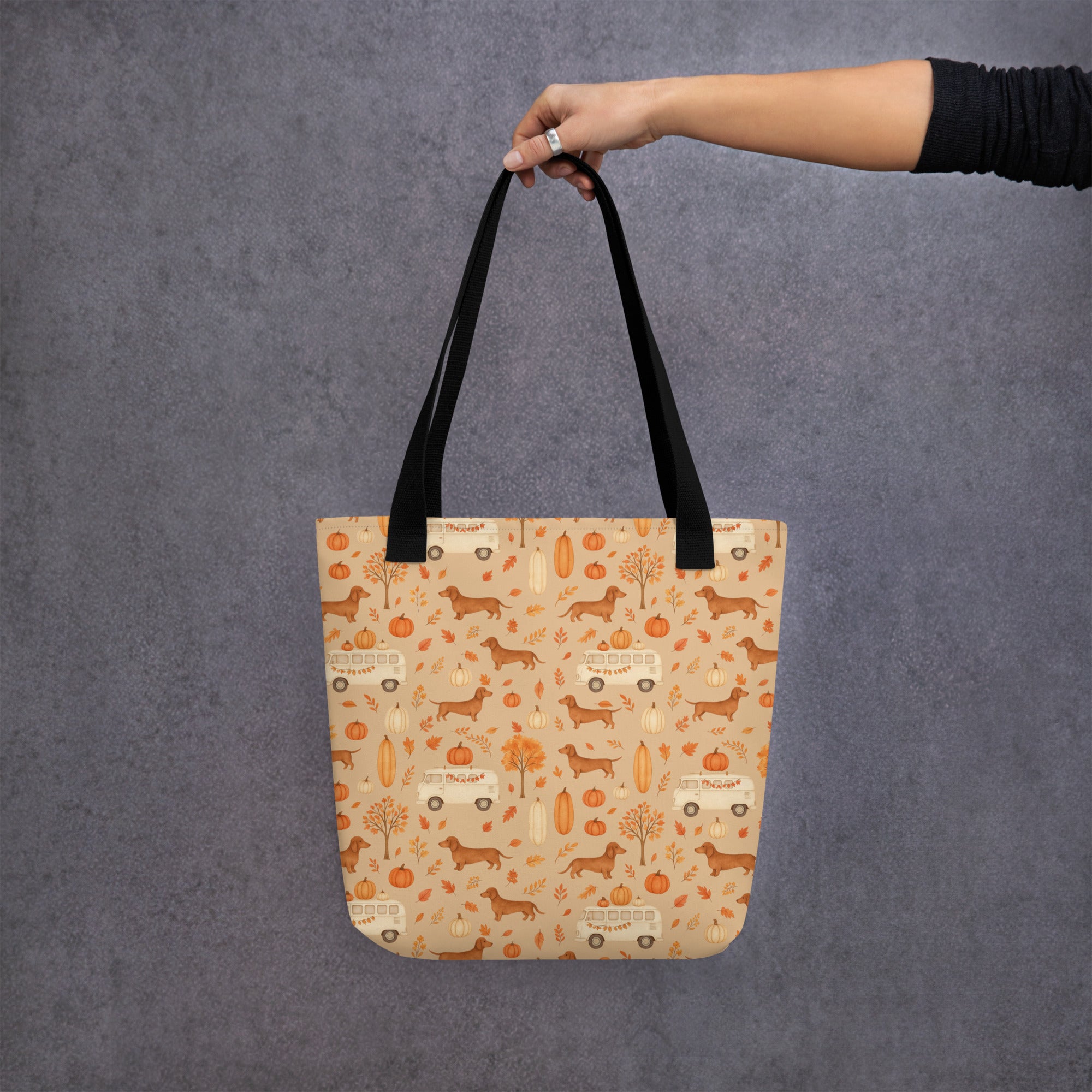 Celebrate autumn adventures with this playful tote bag featuring dachshunds, pumpkins, retro white vans, and crisp fall leaves. Perfect for dachshund lovers who want to carry a little harvest festival spirit wherever they go. This charming design captures all the cozy vibes of pumpkin season and road trip fun in one stylish, practical accessory.