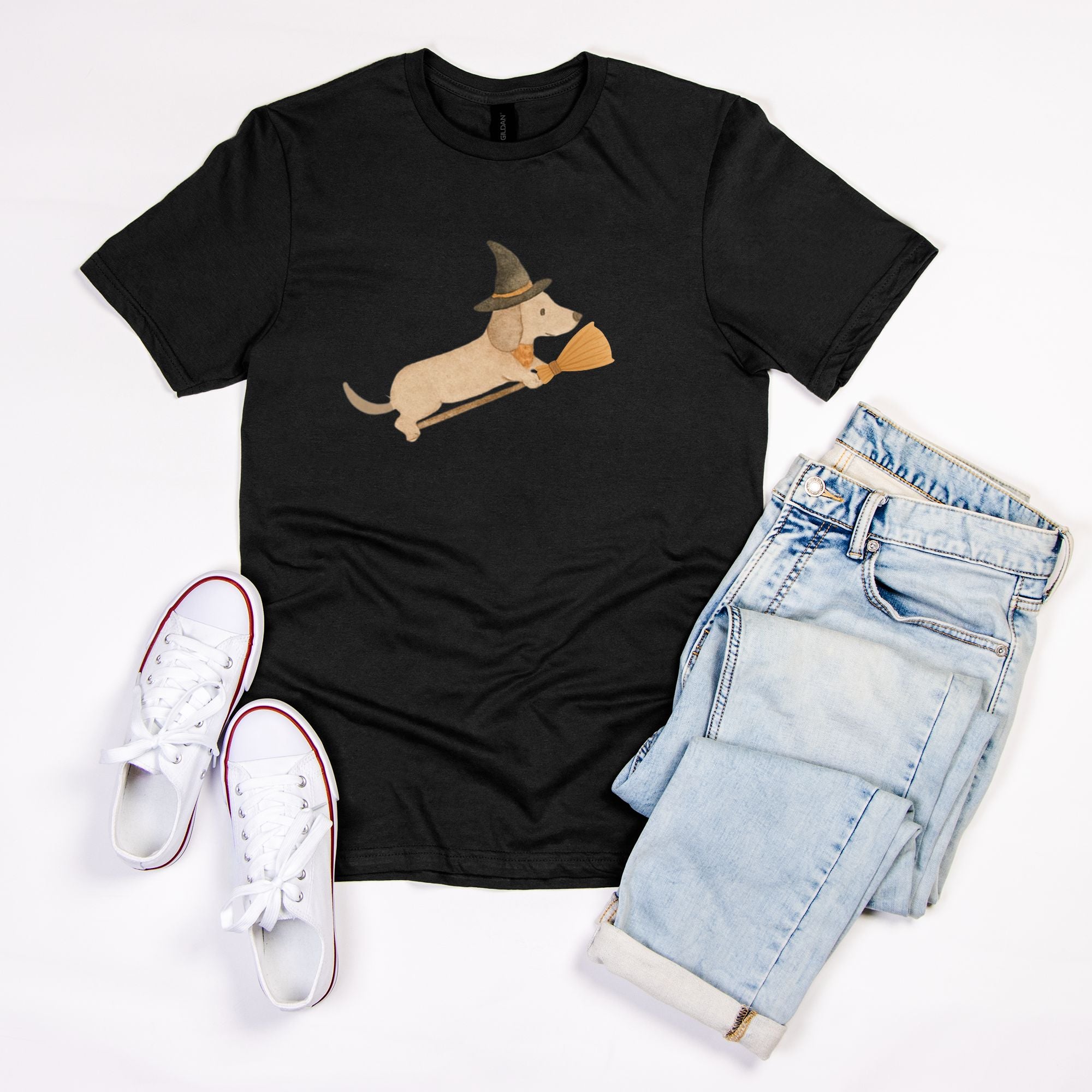 Embrace the spirit of Halloween with our Unisex Soft-style T-Shirt - Weenie Witch, a delightful addition to your festive wardrobe. This charming tee features an adorable design of a single dachshund dressed as a ghost, riding on a witch's broom adorned with a witch's hat. Crafted from Gildan's premium soft-style fabric, this shirt ensures comfort throughout all your Halloween festivities, whether you're out trick-or-treating or enjoying a cozy night in. Available in classic black, it seamlessly complements your favorite spooky accessories. With sizes ranging from S to 3XL, there's a perfect fit for everyone, making it ideal for all dog owners who love to celebrate their furry friends. This shirt is part of our exclusive Halloween 2025 collection, perfect for dachshund moms and a delightful touch of Halloween decor. Share the joy of the season with this enchanting piece that’s sure to spark smiles and affectionate barks. Celebrate the season in style and let your love for your pup shine!
